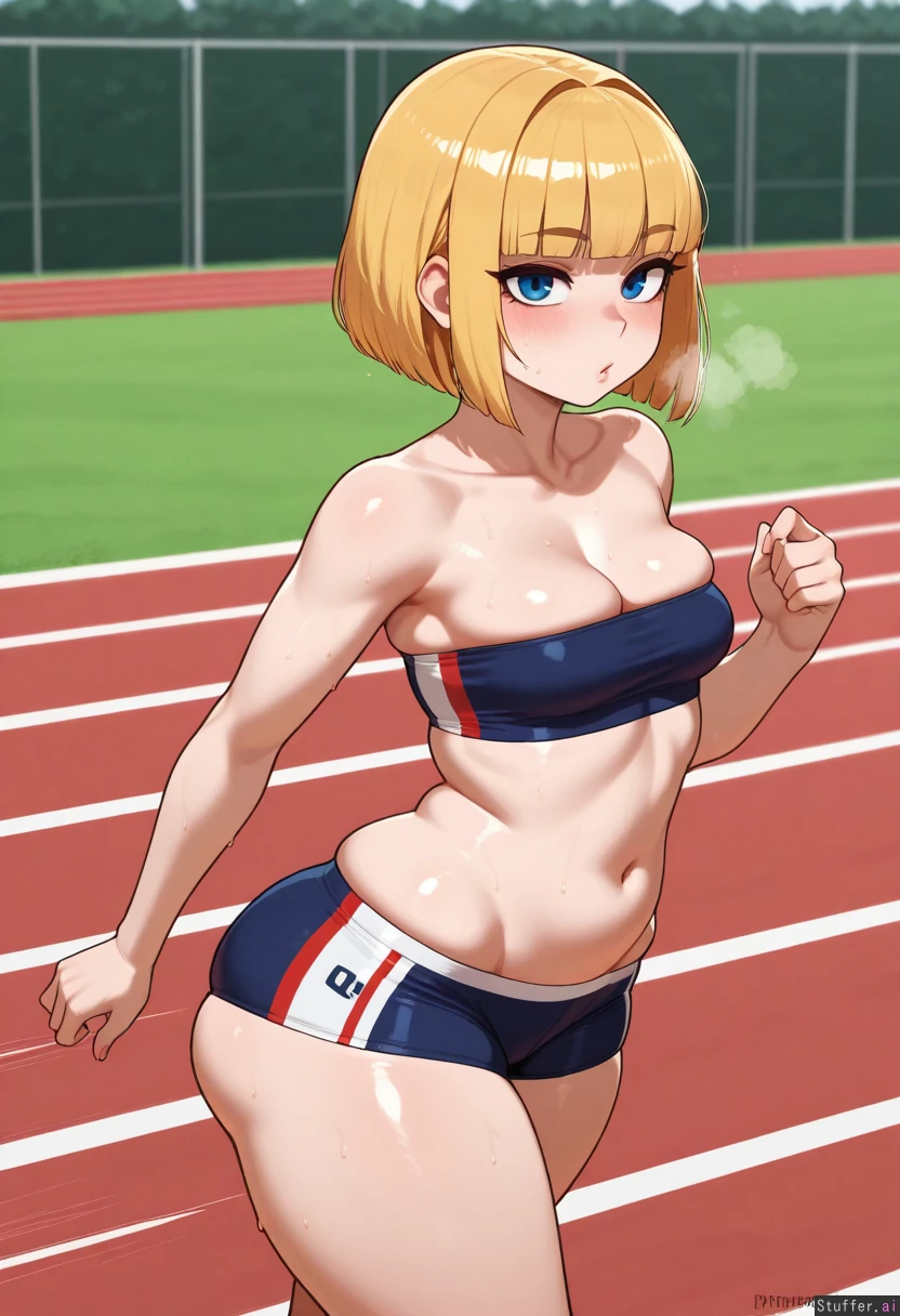 c.cu, betterwithsalt, ourobot, spellsx(artist), krekkov, 1girl, blonde hair, short hair, hime cut, blue eyes, cute face, small breasts, slim, small waist, love handles, midriff, tight strapless top, running shorts, track and field, outgrown clothes, ((skindentation)), sweating, out of breath, bubble butt, massive ass, bottomheavy, wide hips, plump thighs, (huge ass), (butt_crack, butt_cleavage),