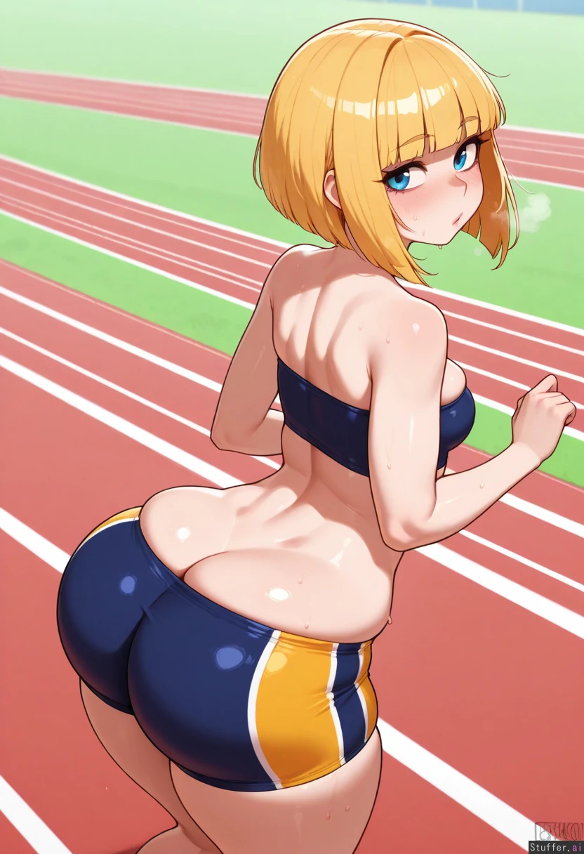c.cu, betterwithsalt, ourobot, spellsx(artist), krekkov, 1girl, blonde hair, short hair, hime cut, blue eyes, cute face, small breasts, slim, small waist, love handles, midriff, tight strapless top, running shorts, track and field, outgrown clothes, ((skindentation)), sweating, out of breath, bubble butt, massive ass, bottomheavy, wide hips, plump thighs, (huge ass), (butt_crack, butt_cleavage), looking_back, back_view,