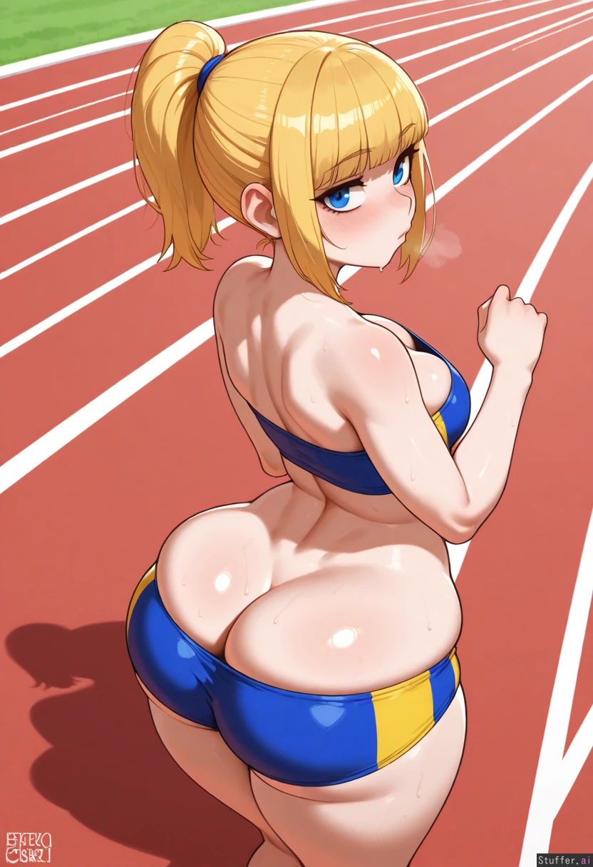 c.cu, betterwithsalt, ourobot, spellsx(artist), krekkov, 1girl, blonde hair, short hair, hime cut, high ponytail, blue eyes, cute face, small breasts, slim, small waist, love handles, midriff, tight strapless top, running shorts, track and field, outgrown clothes, ((skindentation)), sweating, out of breath, bubble butt, massive ass, bottomheavy, wide hips, plump thighs, (huge ass), (butt_crack, butt_cleavage:1.4), looking_back, back_view, cute_pose
