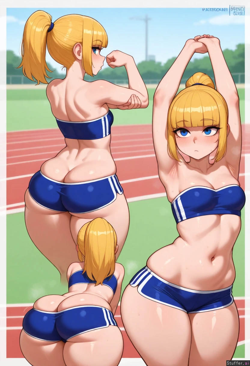 c.cu, betterwithsalt, ourobot, spellsx(artist), krekkov, 1girl, blonde hair, short hair, hime cut, high ponytail, blue eyes, cute face, small breasts, slim, small waist, love handles, midriff, tight strapless top, running shorts, track and field, outgrown clothes, ((skindentation)), sweating, out of breath, bubble butt, massive ass, bottomheavy, wide hips, plump thighs, (huge ass), (butt_crack, butt_cleavage:1.4), looking_back, stretching, cute_pose