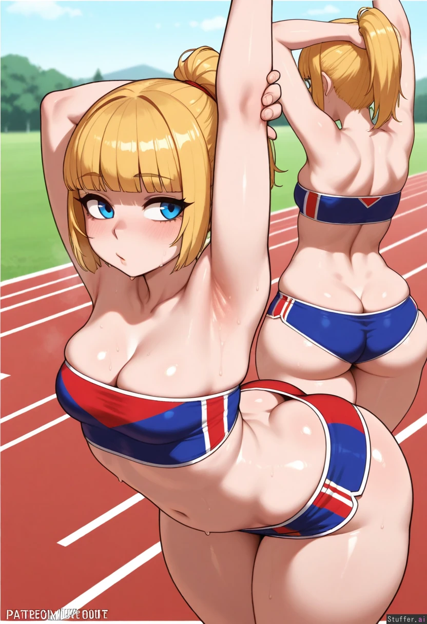 c.cu, betterwithsalt, ourobot, spellsx(artist), krekkov, 1girl, blonde hair, short hair, hime cut, high ponytail, blue eyes, cute face, small breasts, slim, small waist, love handles, midriff, tight strapless top, running shorts, track and field, outgrown clothes, ((skindentation)), sweating, out of breath, bubble butt, massive ass, (bottomheavy, wide hips, plump thighs, huge ass), (butt_crack, butt_cleavage:1.4), looking_back, stretching, cute_pose, (sweating, sweaty, steamy, sweaty armpit ), low angle,