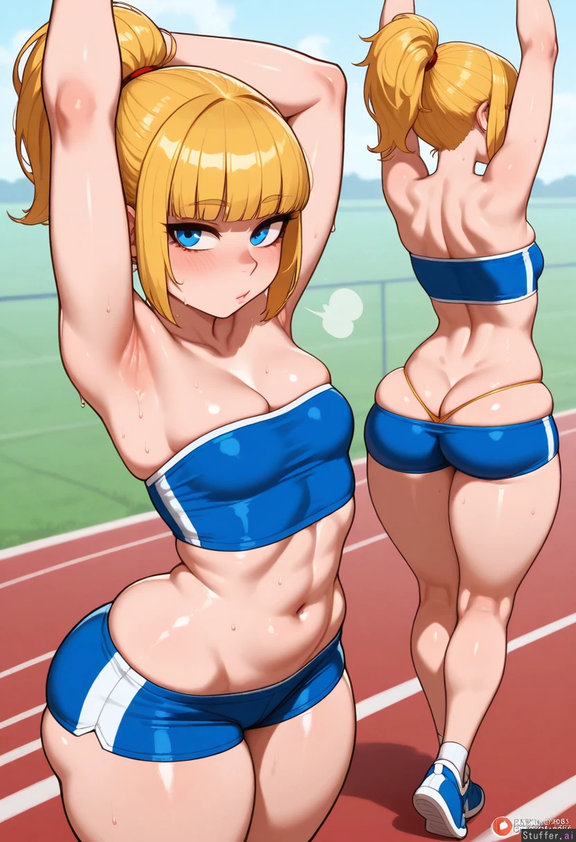 c.cu, betterwithsalt, ourobot, spellsx(artist), krekkov, 1girl, blonde hair, short hair, hime cut, high ponytail, blue eyes, cute face, small breasts, slim, small waist, love handles, midriff, tight strapless top, running shorts, track and field, outgrown clothes, ((skindentation)), sweating, out of breath, bubble butt, massive ass, lean muscle, toned abs, (bottomheavy, thin waist, wide hips, plump thighs, huge ass), (butt_crack, butt_cleavage:1.4), looking_back, stretching, cute_pose, (sweating, sweaty, steamy, sweaty armpit ), low angle,