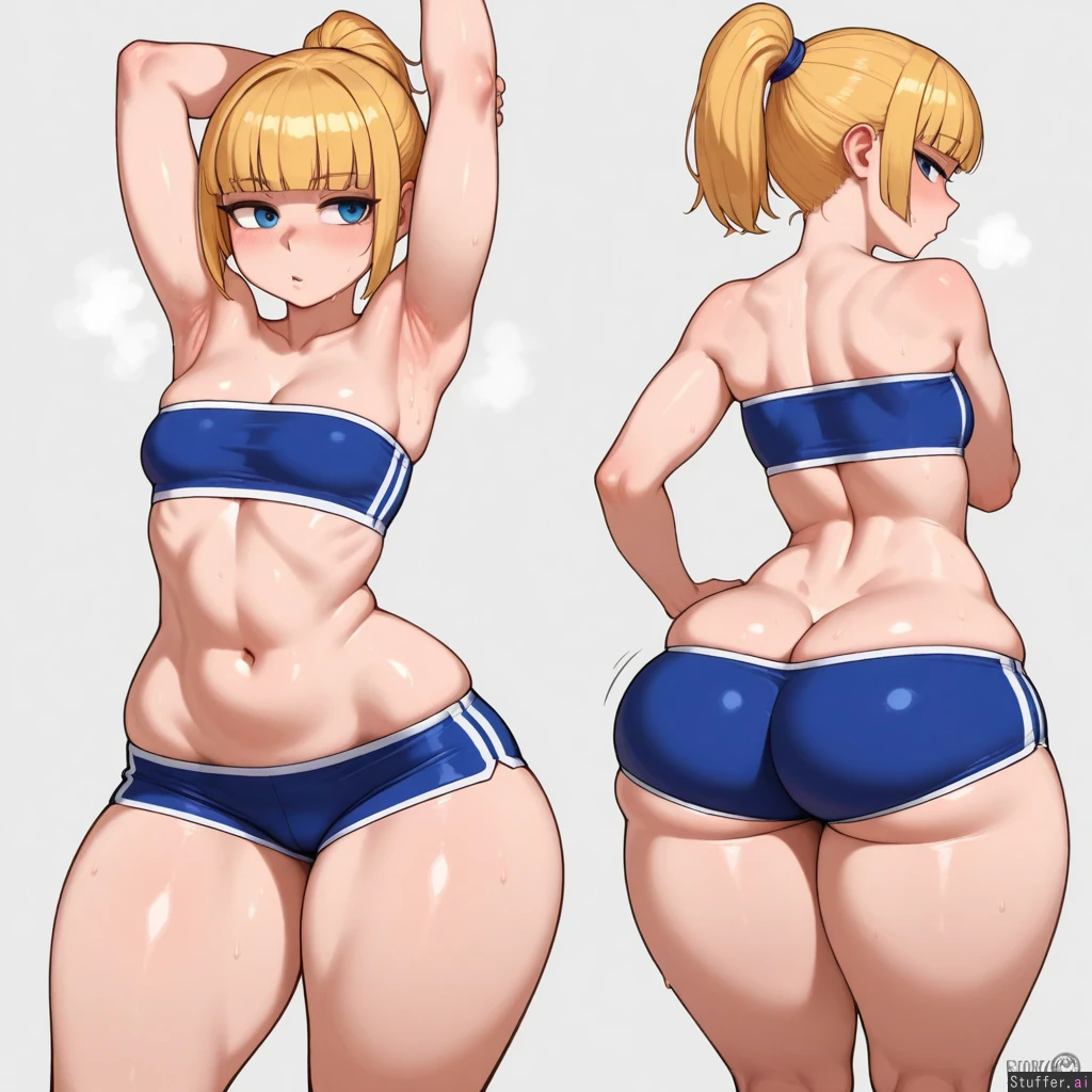c.cu, betterwithsalt, ourobot, spellsx(artist), krekkov, 1girl, blonde hair, short hair, hime cut, high ponytail, blue eyes, cute face, small breasts, flatchest, slim, small waist, love handles, midriff, tight strapless top, running shorts, track and field, outgrown clothes, ((skindentation)), sweating, out of breath, bubble butt, massive ass, lean muscle, toned abs, (bottomheavy, thin waist, wide hips, plump thighs, huge ass:1.2), (butt_crack, butt_cleavage:1.4), looking_back, stretching, cute_pose, (sweating, sweaty, steamy, sweaty armpit ), low angle,