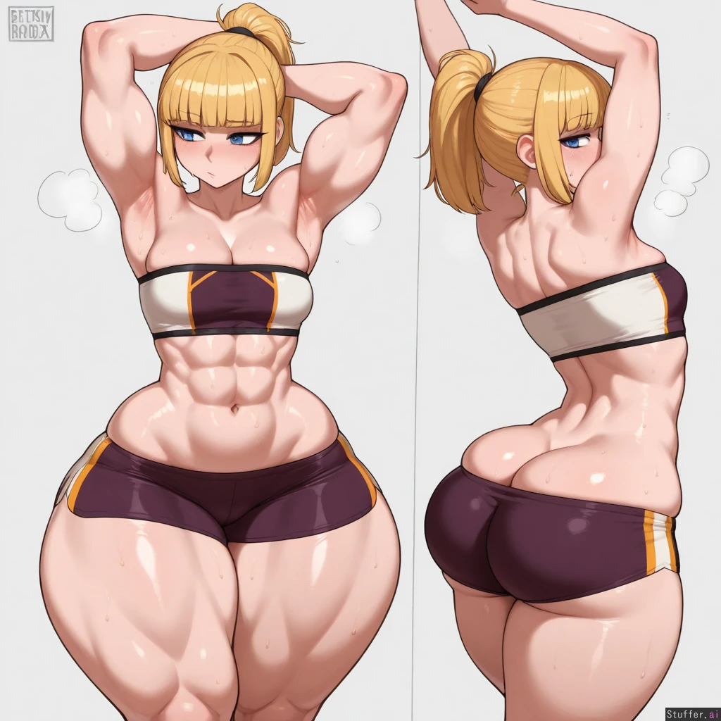 c.cu, betterwithsalt, ourobot, spellsx(artist), krekkov, 1girl, blonde hair, short hair, hime cut, high ponytail, blue eyes, cute face, small breasts, flatchest, slim, small waist, fit, skinny, love handles, midriff, tight strapless top, running shorts, track and field, outgrown clothes, ((skindentation)), sweating, out of breath, bubble butt, massive ass, lean muscle, toned abs, (bottomheavy, thin waist, wide hips, huge muscular thighs, huge ass:1.2), (butt_crack, butt_cleavage:1.4), looking_back, stretching, cute_pose, (sweating, sweaty, steamy, sweaty armpit ), low angle,