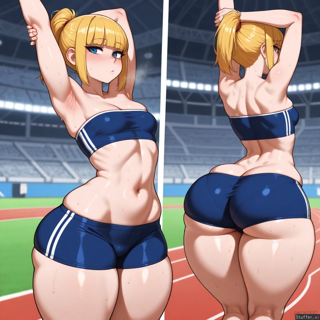 c.cu, betterwithsalt, ourobot, spellsx(artist), krekkov, 1girl, blonde hair, short hair, hime cut, high ponytail, blue eyes, cute face, small breasts, flatchest, slim, small waist, fit, skinny, love handles, midriff, tight strapless top, running shorts, (track and field, stadium), outgrown clothes, ((skindentation)), sweating, out of breath, bubble butt, massive ass, (lean muscle, toned abs:0.7), (bottomheavy, thin waist, wide hips, huge thighs, huge ass:1.2), (butt_crack, butt_cleavage:1.4), looking_back, stretching, cute_pose, (sweating, sweaty, steamy, sweaty armpit ), low angle,