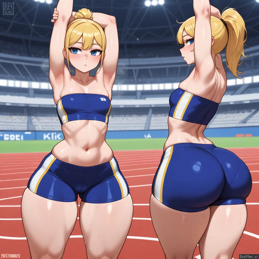 c.cu, betterwithsalt, ourobot, spellsx(artist), krekkov, 1girl, blonde hair, thin bangs, high ponytail, blue eyes, cute face, small breasts, flatchest, slim, small waist, fit, skinny, love handles, midriff, tight strapless top, running shorts, (track and field, stadium), outgrown clothes, ((skindentation)), sweating, out of breath, bubble butt, massive ass, (lean muscle, toned abs:0.7), (bottomheavy, thin waist, wide hips, huge thighs, huge ass:1.2), (butt_crack, butt_cleavage:1.0), looking_back, stretching, cute_pose, (sweating, sweaty, steamy, sweaty armpit ), low angle,