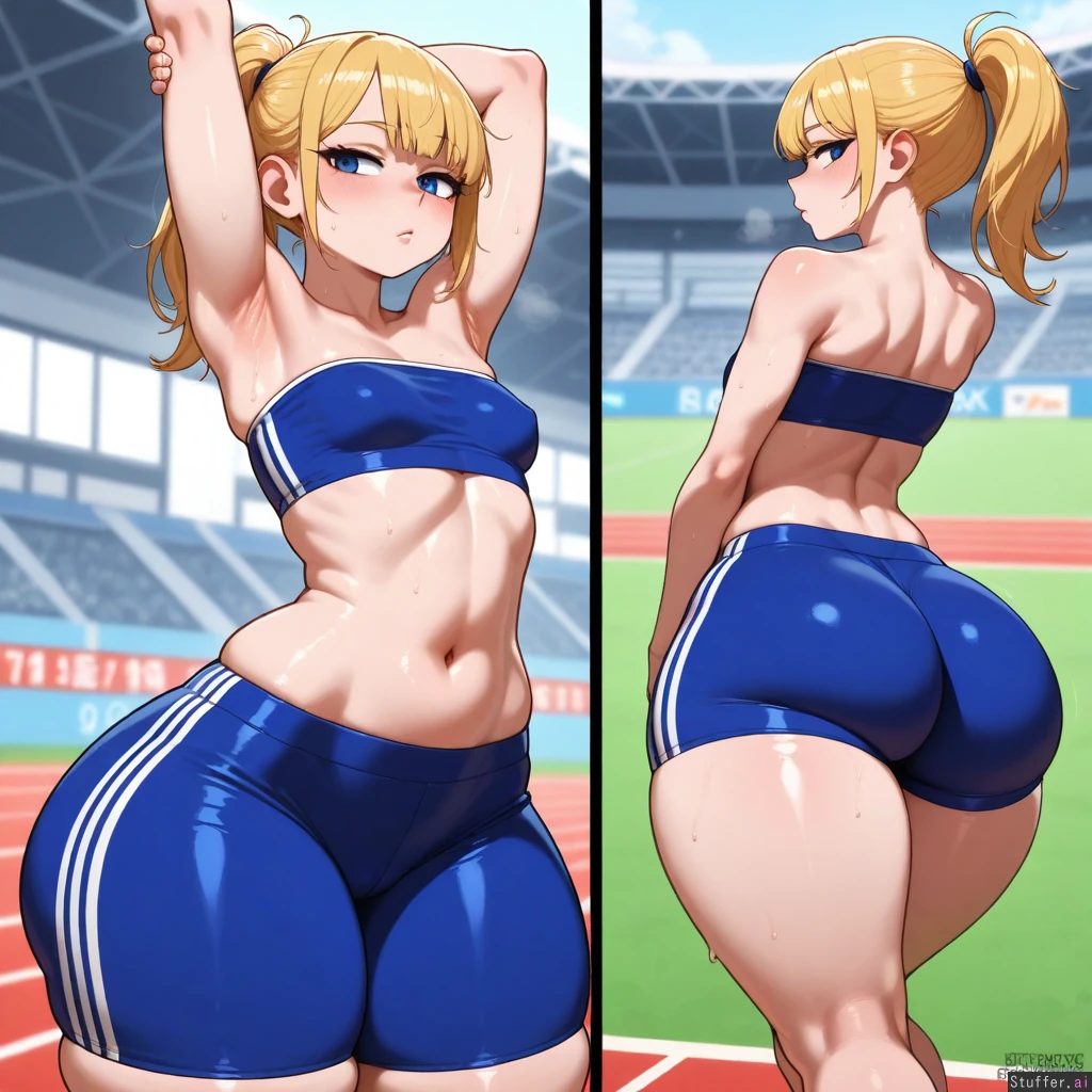 c.cu, betterwithsalt, ourobot, spellsx(artist), krekkov, 1girl, blonde hair, thin bangs, high ponytail, blue eyes, cute face, small perky breasts, slim, small waist, fit, skinny, love handles, midriff, tight strapless top, running shorts, (track and field, stadium), outgrown clothes, ((skindentation)), sweating, out of breath, bubble butt, massive ass, (lean muscle, toned abs:0.7), (bottomheavy, thin waist, wide hips, huge thighs, huge ass:1.2), (butt_crack, butt_cleavage:1.0), looking_back, stretching, cute_pose, (sweating, sweaty, steamy, sweaty armpit ), low angle,
