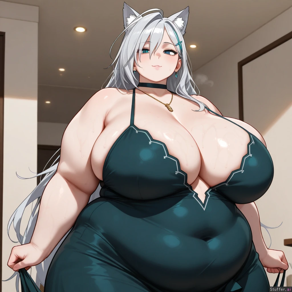 best quality, high rating, high resolution, HDR, 4K_HDR, best definition, best resolution, best detail, perfect anatomy, correct anatomy, perfect quality, 4k, realistic, photo realism, good lighting, detailed background, realistic background, crisp detail, (beautiful woman, 1 woman), (beautiful face, strong jawline, detailed face, gorgeous face), (in a dark luxurious condo), (wearing a black dress with a halter top that covers her belly and flows to the floor, expensive necklace, earrings, jewelry), (sweaty, horny, aroused, lustful, blissful, pleased), ((massive hips), (gigantic boobs), (gigantic swollen belly)), (art style: bokunoheroacademia), (shiroko terror),((fat arms:1.5)),(love handles),(detailed obese face:1.2),