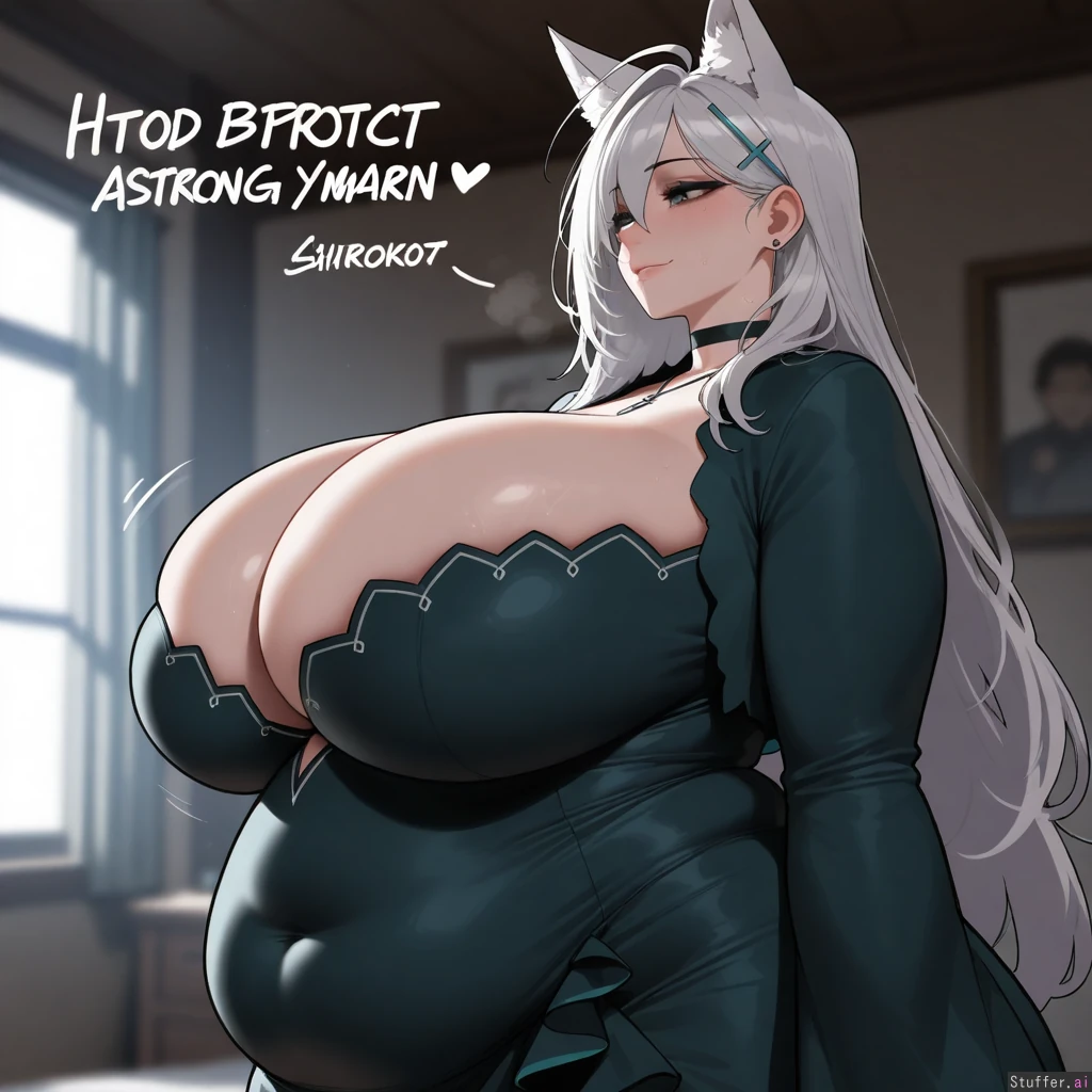 nyantcha(artist), krekkov(artist),best quality, high rating, high resolution, HDR, 4K_HDR, best definition, best resolution, best detail, perfect anatomy, correct anatomy, perfect quality, 4k, realistic, photo realism, good lighting, detailed background, realistic background, crisp detail, (beautiful woman, 1 woman), (beautiful face, strong jawline, detailed face, gorgeous face), (in a dark luxurious condo), (wearing a black dress, expensive necklace, earrings, jewelry), (horny, aroused, lustful, blissful, pleased), ((massive hips), (gigantic boobs), (gigantic swollen belly)), (shiroko terror),((fat arms:1.2)),(love handles),(detailed obese face:1.2),((side view)),