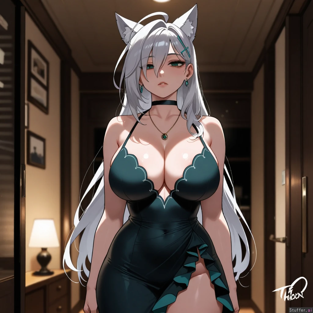 nyantcha(artist), krekkov(artist),best quality, high rating, high resolution, HDR, 4K_HDR, best definition, best resolution, best detail, perfect anatomy, correct anatomy, perfect quality, 4k, realistic, photo realism, good lighting, detailed background, realistic background, crisp detail, (beautiful woman, 1 woman), (in a dark luxurious condo), (wearing a black dress, expensive necklace, earrings, jewelry), (shiroko terror),(thin),athletic body,defined body,(detailed obese body:0.7),(large breasts),