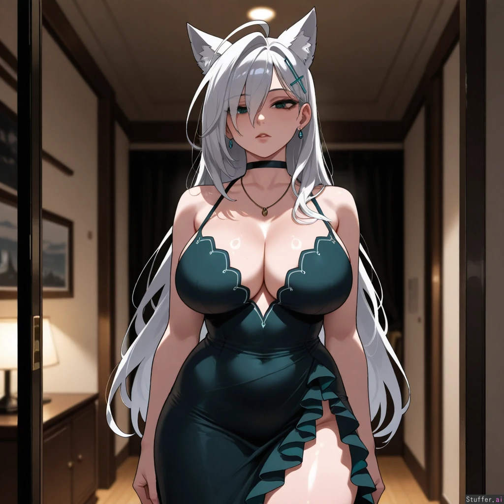 nyantcha(artist), krekkov(artist),best quality, high rating, high resolution, HDR, 4K_HDR, best definition, best resolution, best detail, perfect anatomy, correct anatomy, perfect quality, 4k, realistic, photo realism, good lighting, detailed background, realistic background, crisp detail, (beautiful woman, 1 woman), (in a dark luxurious condo), (wearing a black dress, expensive necklace, earrings, jewelry), (shiroko terror),(thin),athletic body,defined body,(detailed obese body:0.9),(large breasts),
