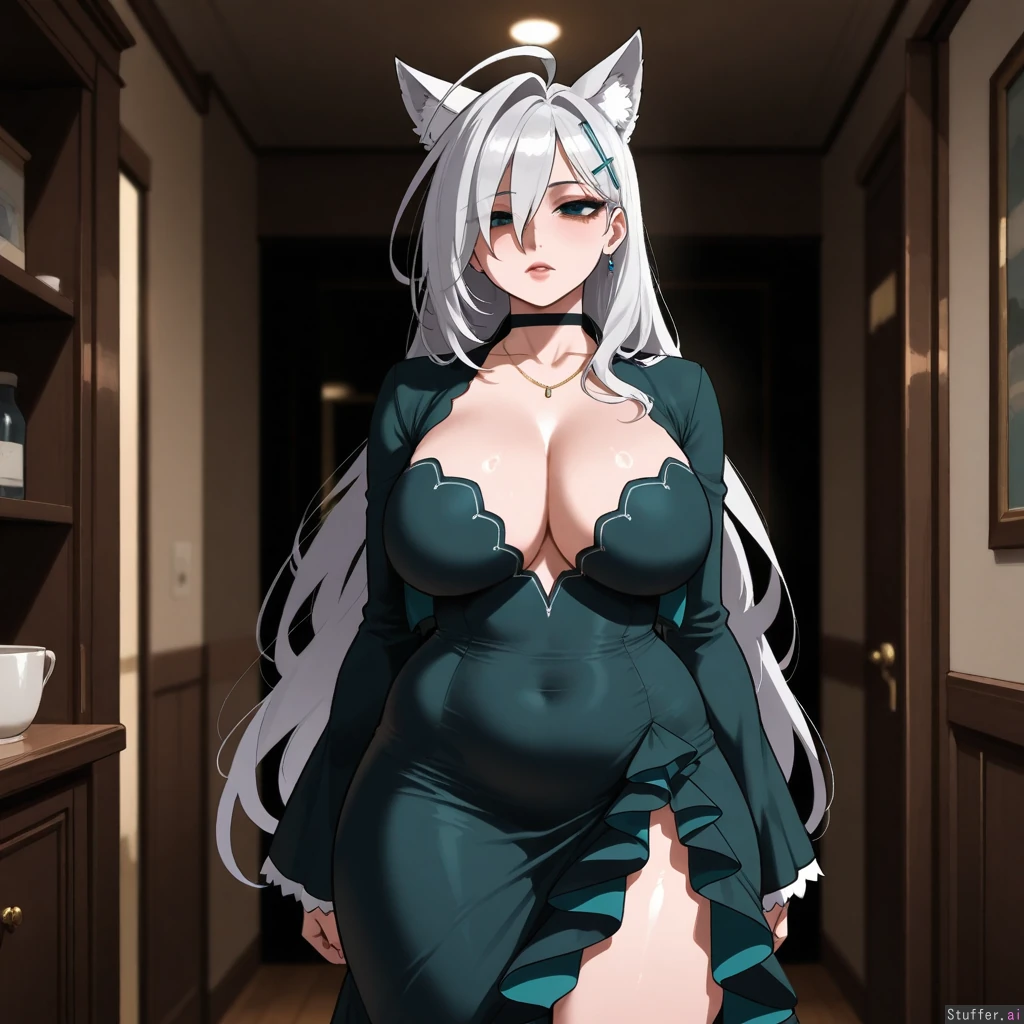 nyantcha(artist), krekkov(artist),best quality, high rating, high resolution, HDR, 4K_HDR, best definition, best resolution, best detail, perfect anatomy, correct anatomy, perfect quality, 4k, realistic, photo realism, good lighting, detailed background, realistic background, crisp detail, (beautiful woman, 1 woman), (in a dark luxurious condo), (wearing a black dress, expensive necklace, earrings, jewelry), (shiroko terror),(thin),athletic body,defined body,(detailed obese body:1.1),(large breasts),