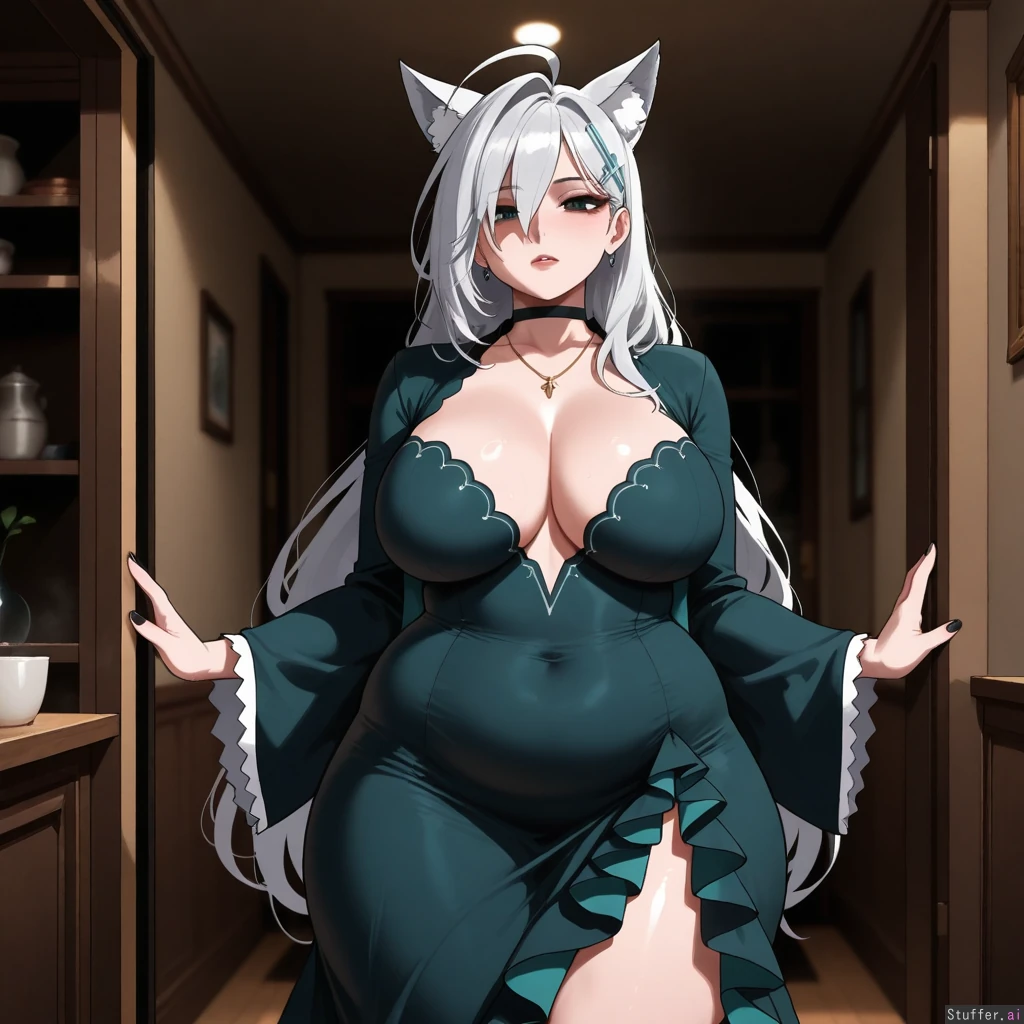 nyantcha(artist), krekkov(artist),best quality, high rating, high resolution, HDR, 4K_HDR, best definition, best resolution, best detail, perfect anatomy, correct anatomy, perfect quality, 4k, realistic, photo realism, good lighting, detailed background, realistic background, crisp detail, (beautiful woman, 1 woman), (in a dark luxurious condo), (wearing a black dress, expensive necklace, earrings, jewelry), (shiroko terror),(thin),athletic body,defined body,(detailed obese body:1.2),(large breasts),