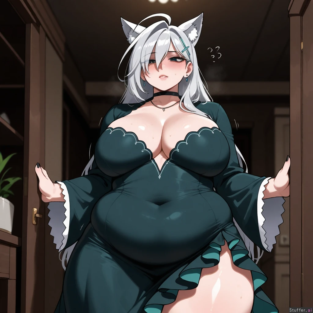nyantcha(artist), krekkov(artist),best quality, high rating, high resolution, HDR, 4K_HDR, best definition, best resolution, best detail, perfect anatomy, correct anatomy, perfect quality, 4k, realistic, photo realism, good lighting, detailed background, realistic background, crisp detail, (beautiful woman, 1 woman), (in a dark luxurious condo), (wearing a black dress, expensive necklace, earrings, jewelry), (shiroko terror),(thin),athletic body,defined body,(detailed obese body:1.4),(large breasts),embarassed,blushing,(motion lines),