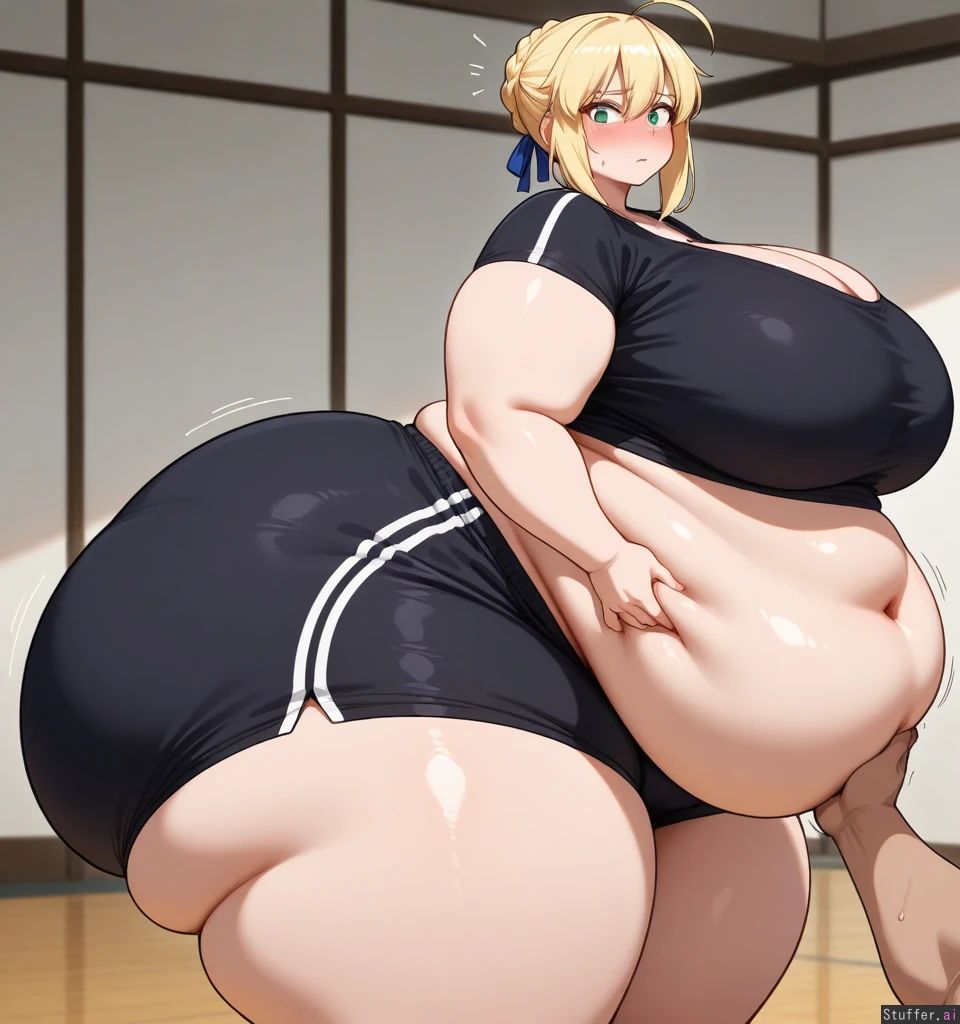 uhd, high resolution, best_quality, dynamic, (1girl, very fat and beautiful woman, attractive large lady), (hdr), natural fat body proportions, ((artoria pendragon)), (Arousingly obese woman, SSBBW, adult, feminine fat beauty, wide eyes), hyper weight gain, very tall, bottom heavy, soft squishy juicy fat body, (morbidly_obese:0.6), fat arms, fat legs, (gigantic_fat_thighs:1.6), (gigantic fat bulging butt:1.4), (gigantic_fat_belly:1.4), love handles, (black crop top, midriff, black gym shorts:1.5), Looking at her belly, Flustered red face, aroused, 1pov, pov smaller than fat girl, belly grab, getting her belly groped by anonymous pov hands