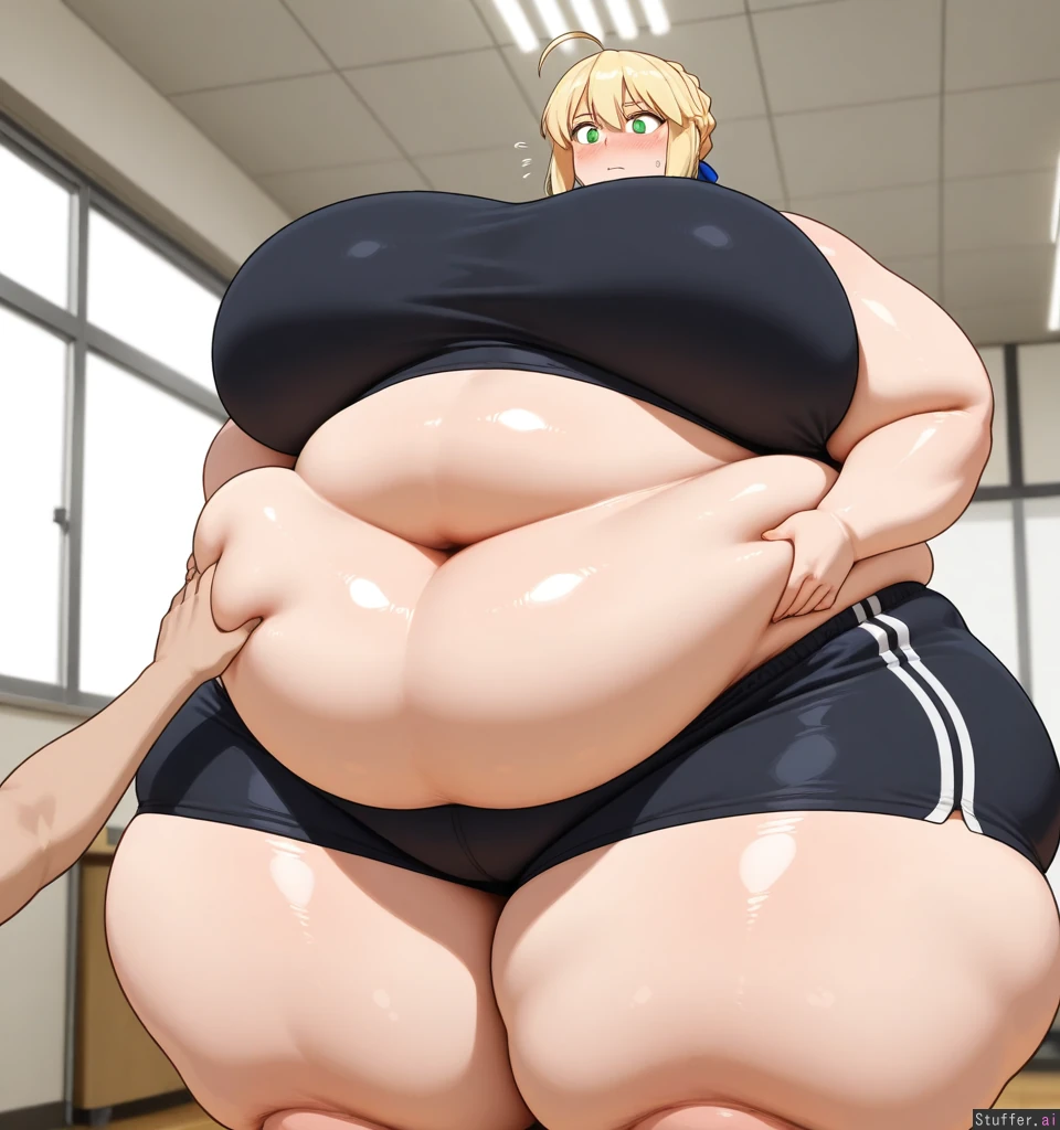 uhd, high resolution, best_quality, dynamic, (1girl, very fat and beautiful woman, attractive large lady), (hdr), natural fat body proportions, ((artoria pendragon)), ( adult, feminine, wide eyes), very tall, bottom heavy, (morbidly_obese:1.5), fat arms, fat legs, (gigantic_fat_thighs:1.6), (gigantic fat bulging butt:1.2), (gigantic_fat_belly:1.4), love handles, (black crop top, midriff, black gym shorts:1.5), Looking at her belly, Flustered red face, aroused, 1pov, pov smaller than fat girl, belly grab, getting her belly groped by anonymous pov hands