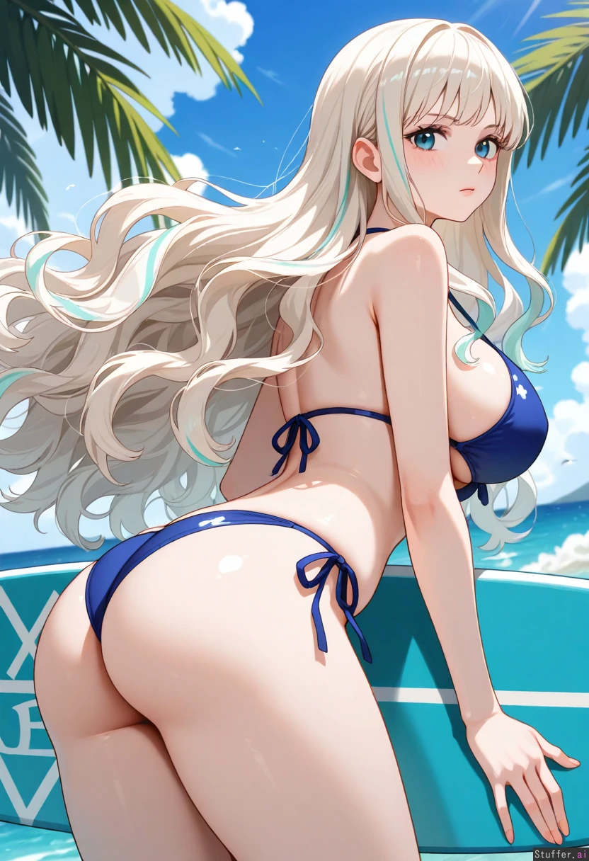 platinum_blonde_hair, (((light_blue_highlights))), long_hair, fluffy_hair, light_teal_eyes, pale_skin, swimsuit, large_breasts, wavy_hair, voluminous_hair, large_ass, surfboard, tropical_background (((One Piece)))