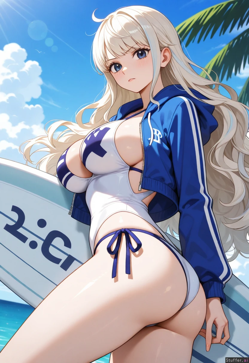 platinum_blonde_hair, (((light_blue_highlights))), long_hair, fluffy_hair, light_teal_eyes, pale_skin, swimsuit, large_breasts, wavy_hair, voluminous_hair, large_ass, surfboard, tropical_background, jacket (((One Piece)))