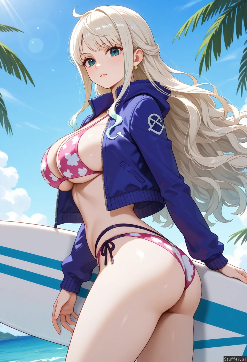 platinum_blonde_hair, (((light_blue_highlights))), long_hair, fluffy_hair, light_teal_eyes, pale_skin, swimsuit, large_breasts, wavy_hair, voluminous_hair, large_ass, surfboard, tropical_background, jacket (((One Piece)))