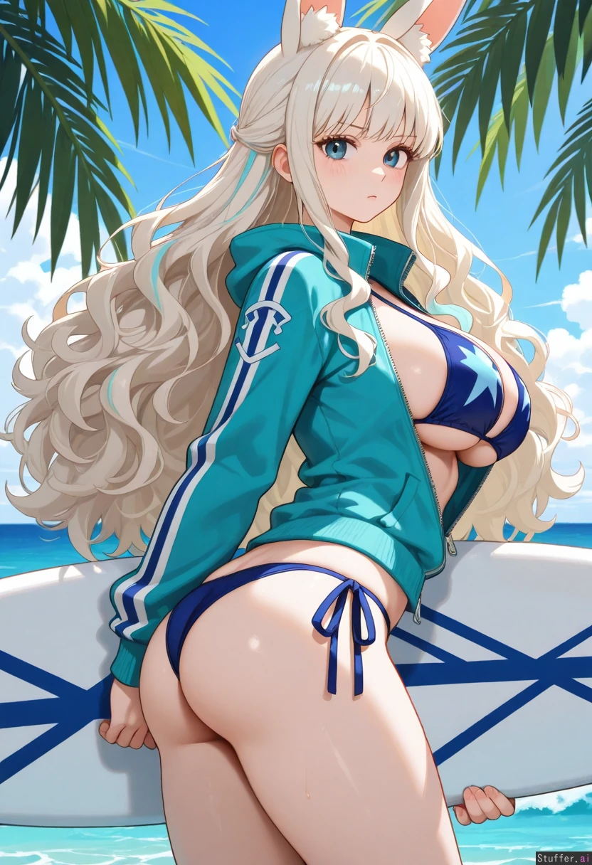 platinum_blonde_hair, (((light_blue_highlights))), long_hair, fluffy_hair, light_teal_eyes, pale_skin, swimsuit, large_breasts, wavy_hair, voluminous_hair, large_ass, surfboard, tropical_background, jacket, ears_pierced (((One Piece)))