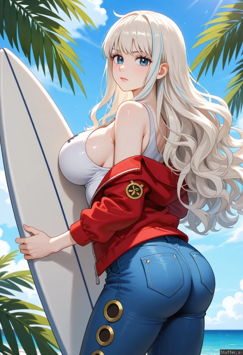 platinum_blonde_hair, (((light_blue_highlights))), long_hair, fluffy_hair, light_teal_eyes, pale_skin, large_breasts, wavy_hair, voluminous_hair, large_ass, surfboard, tropical_background, jacket, tank_top, jeans (((One Piece)))