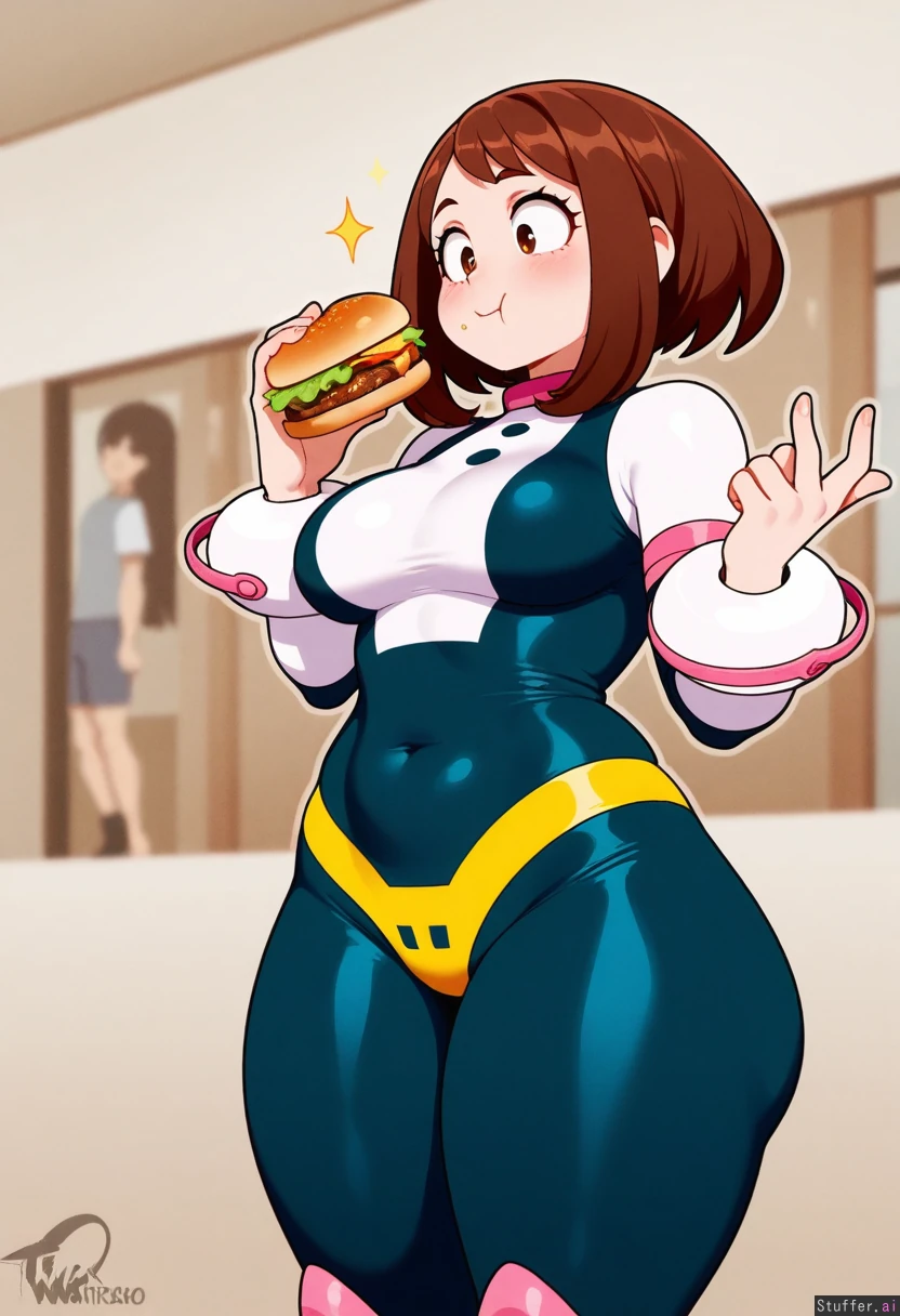 Nyantcha(Artist), Meocoill(Artist), Orristerioso(Artist), 1 Girl, (uraraka ochaco), wearing her superhero costume (Bottom heavy body and thick thighs :1.32), (big round breasts, belly :1.0), Standing, holding burger, small breasts, very thin and fit, eating