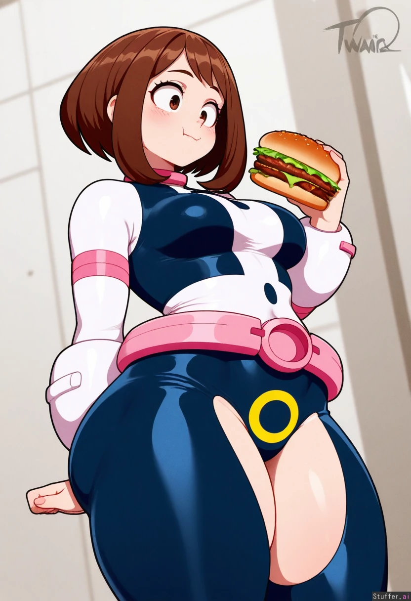 Nyantcha(Artist), Meocoill(Artist), Orristerioso(Artist), 1 Girl, (uraraka ochaco), wearing her superhero costume (Bottom heavy body and thick thighs :1.38), (big round breasts, belly :1.0), Standing, holding burger, small breasts, very thin and fit, eating