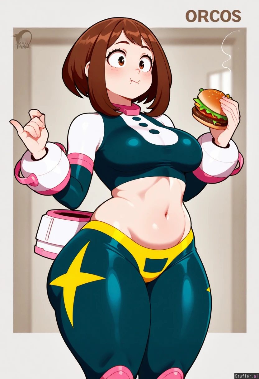 Nyantcha(Artist), Meocoill(Artist), Orristerioso(Artist), 1 Girl, (uraraka ochaco), wearing her superhero costume (Bottom heavy body and thick thighs :1.50), (big round breasts, belly :1.05), Standing, holding burger, small breasts, very thin and fit, eating