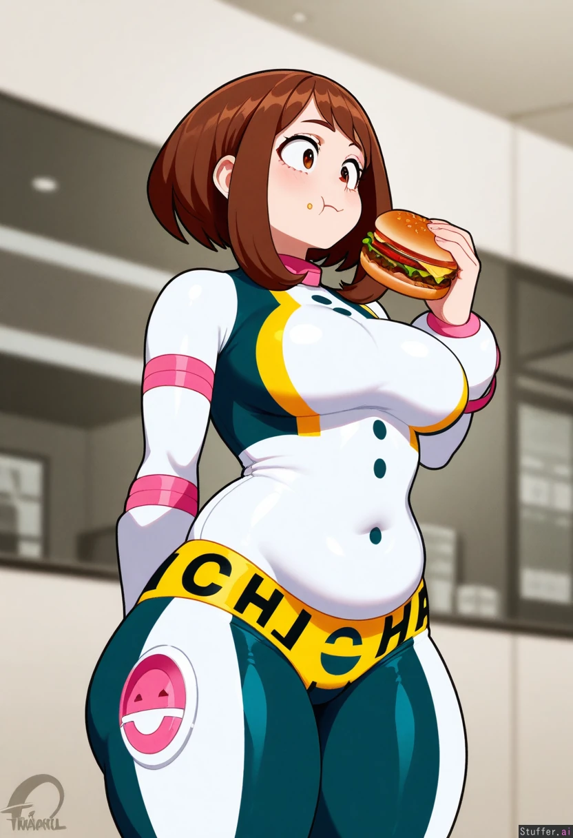 Nyantcha(Artist), Meocoill(Artist), Orristerioso(Artist), 1 Girl, (uraraka ochaco), wearing her superhero costume (Bottom heavy body and thick thighs :1.50), (big round breasts, belly :1.10), Standing, holding burger, small breasts, very thin and fit, eating