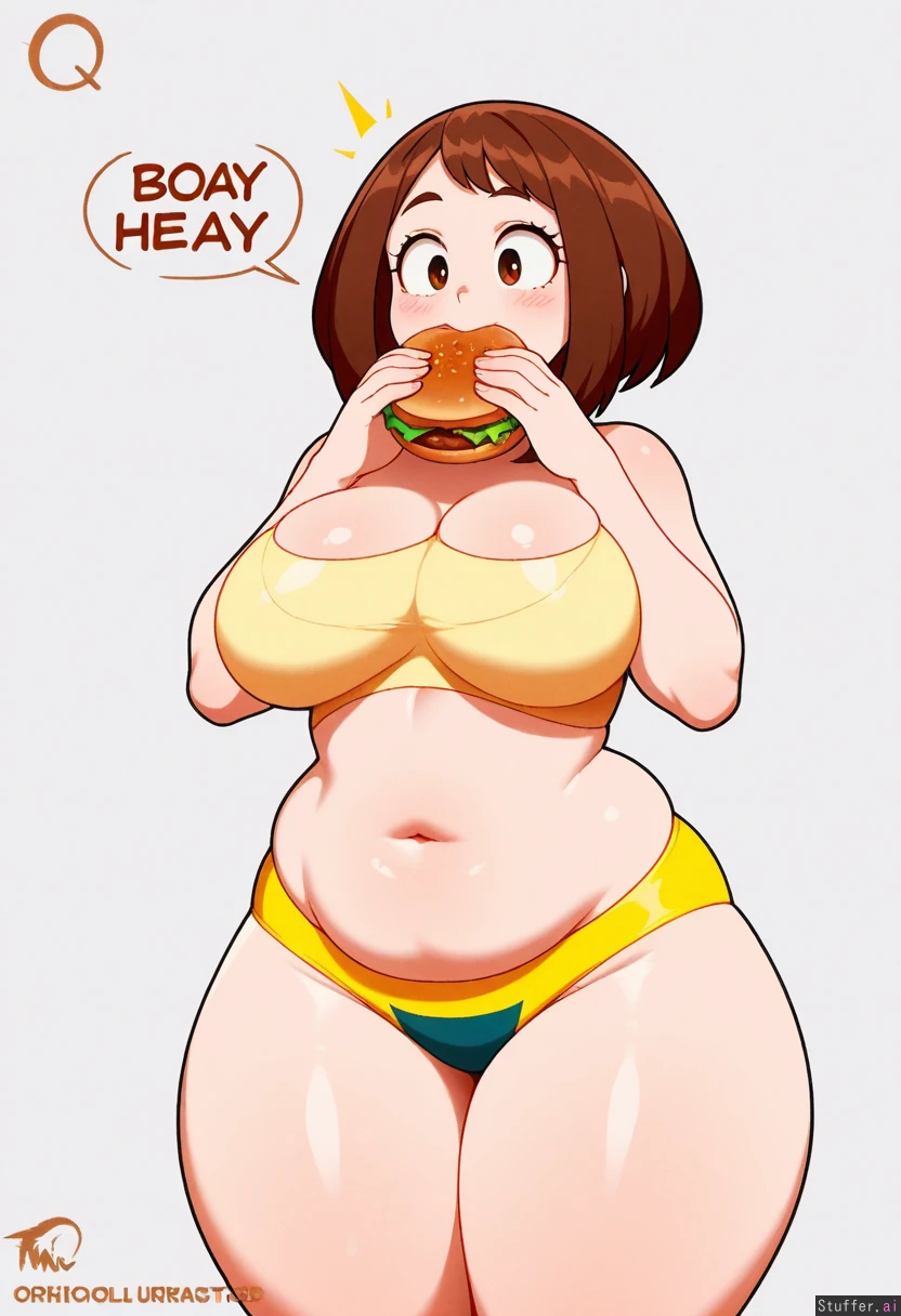 Nyantcha(Artist), Meocoill(Artist), Orristerioso(Artist), 1 Girl, (uraraka ochaco), wearing her superhero costume (Bottom heavy body and thick thighs :1.50), (big round breasts, belly :1.35), Standing, holding burger, small breasts, very thin and fit, eating