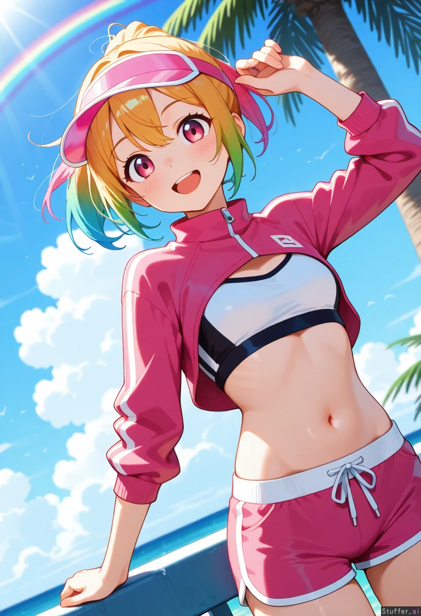 rainbow_hair, pink_eyes, cropped_jacket, small_breasts, tropical, sports_bra, smiling, enjoying_the_sunlight, sports_shorts, visor_cap, ponytail