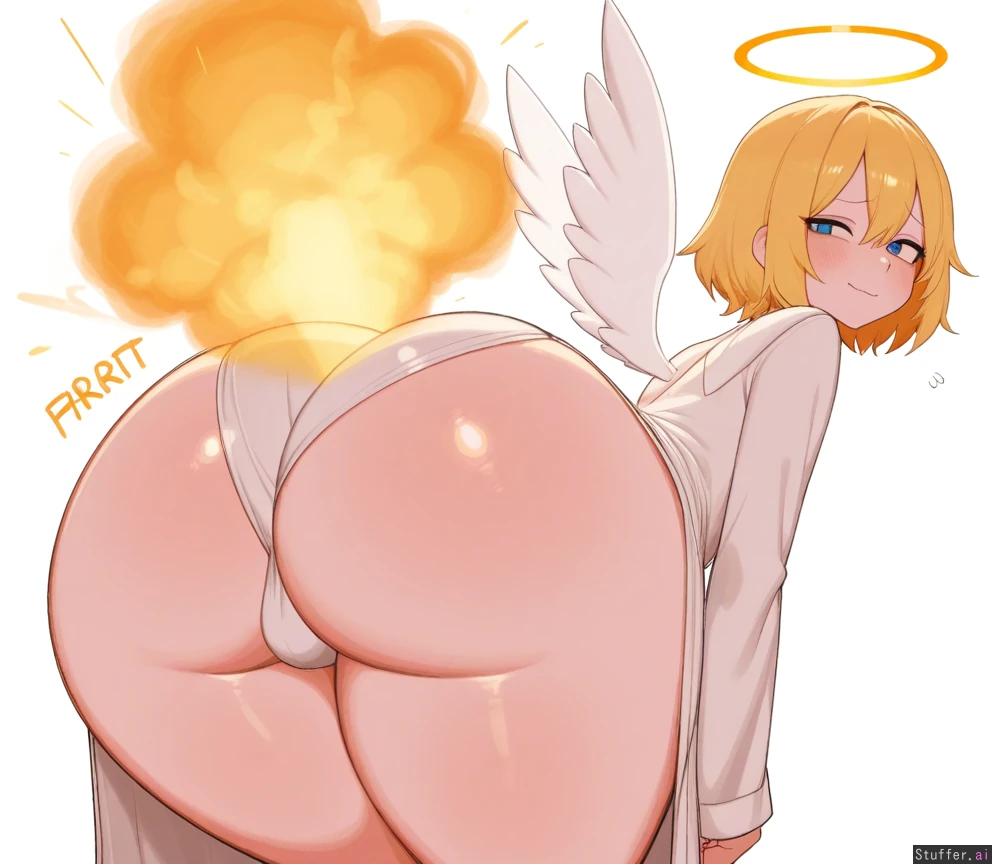 (((Fart art))) (((farting))) ((gas cloud)) (fart sound effect) ((thick gas fart cloud)) absurdres, 8k, perfect anatomy, masterpiece, beautiful face, beautiful eyes, RockSolidArt. /(artist/), RockSolidArt(artist/) ,8), cute, petite femboy, (male), ((solo male)) solo, angel, halo, wings, (angel), short hair, messy blonde hair, embarrassed, blush, smug, looking at viewer, stretched_clothing, white robes,(merunyaa, (usa37107692:1.2), (ohasi_art), betterwithsalt), (huge ass), ((((fat thighs)))), (thigh overflow), ((((wide hips)))), ((bloated)) ((male)) ((flat))