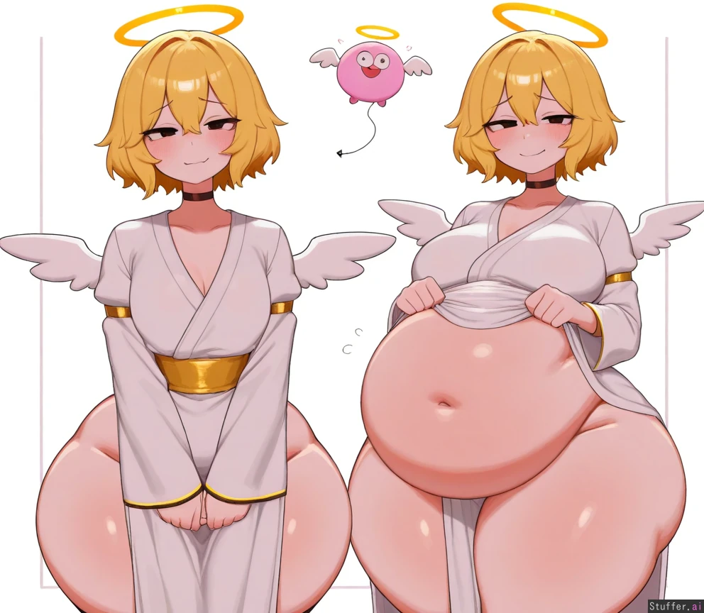 ((blimp)) ((fat belly)) ((fat butt)) ((chubby)) ((obese)) absurdres, 8k, perfect anatomy, masterpiece, beautiful face, beautiful eyes, RockSolidArt. /(artist/), RockSolidArt(artist/) ,8), cute, petite femboy, (male), ((solo male)) solo, angel, halo, wings, (angel), short hair, messy blonde hair, embarrassed, blush, smug, looking at viewer, stretched_clothing, white robes,(merunyaa, (usa37107692:1.2), (ohasi_art), betterwithsalt), (huge ass), ((((fat thighs)))), (thigh overflow), ((((wide hips)))), ((bloated)) ((male)) ((flat))