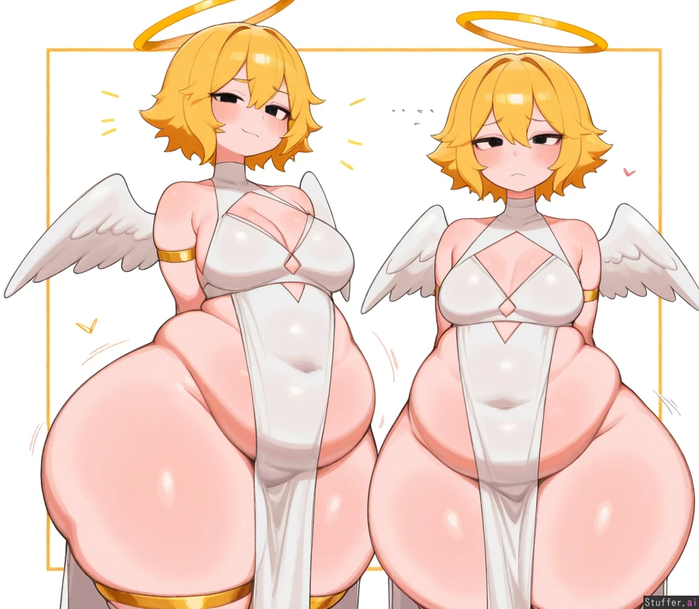 Solo male ((blimp)) ((fat belly)) ((fat butt)) ((chubby)) ((obese)) absurdres, 8k, perfect anatomy, masterpiece, beautiful face, beautiful eyes, RockSolidArt. /(artist/), RockSolidArt(artist/) ,8), cute, petite femboy, (male), ((solo male)) solo, angel, halo, wings, (angel), short hair, spiky blonde hair, embarrassed, blush, smug, looking at viewer, stretched_clothing, white robes, (merunyaa, (usa37107692:1.2), (ohasi_art), betterwithsalt), (huge ass), ((((fat thighs)))), (thigh overflow), ((((wide hips)))), ((bloated)) ((male)) ((flat))