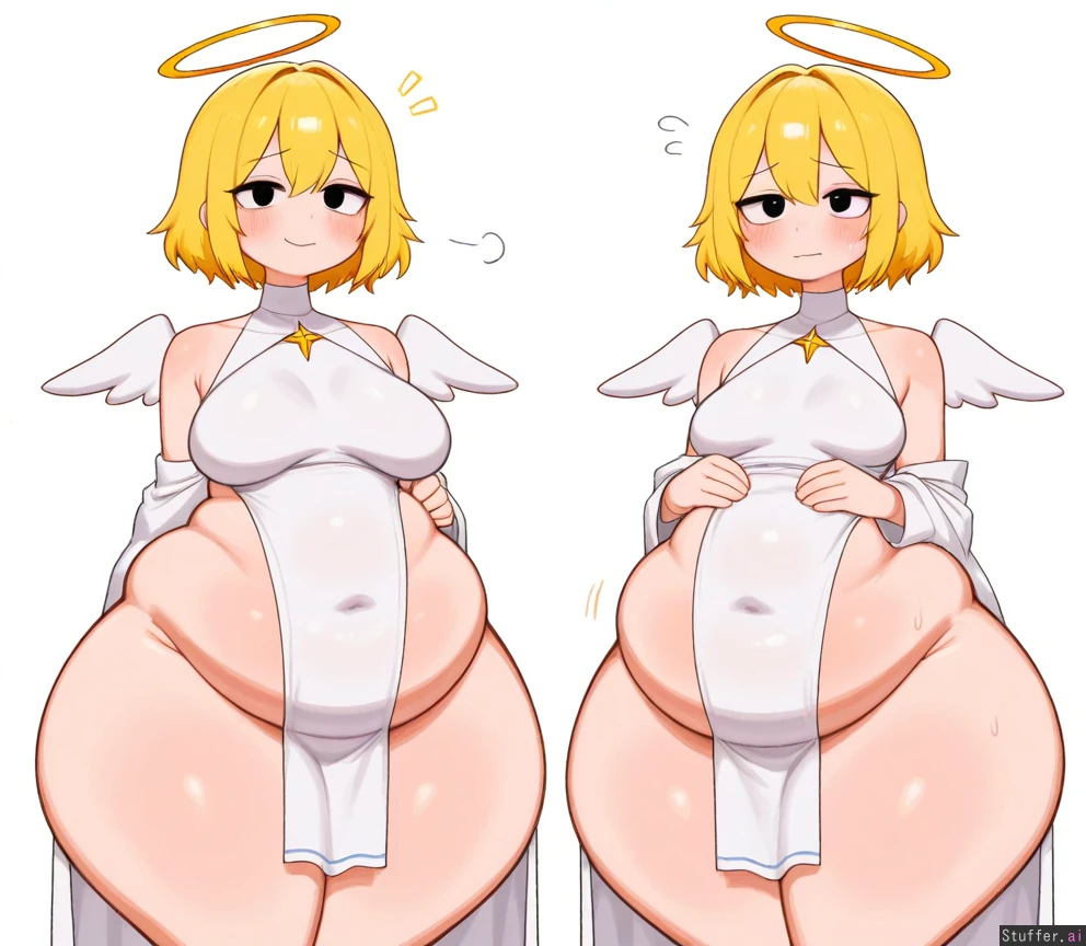 (((Solo male))) ((blimp)) ((fat belly)) ((fat butt)) ((chubby)) ((obese)) ((weight gain)) blob, slob absurdres, 8k, perfect anatomy, masterpiece, beautiful face, beautiful eyes, RockSolidArt. /(artist/), RockSolidArt(artist/) ,8), cute, petite femboy, (male), ((solo male)) solo, angel, halo, wings, (angel), short hair, spiky blonde hair, embarrassed, blush, smug, looking at viewer, stretched_clothing, white robes, (merunyaa, (usa37107692:1.2), (ohasi_art), betterwithsalt), (huge ass), ((((fat thighs)))), (thigh overflow), ((((wide hips)))), ((bloated)) ((male)) ((flat)) ((small boobs))