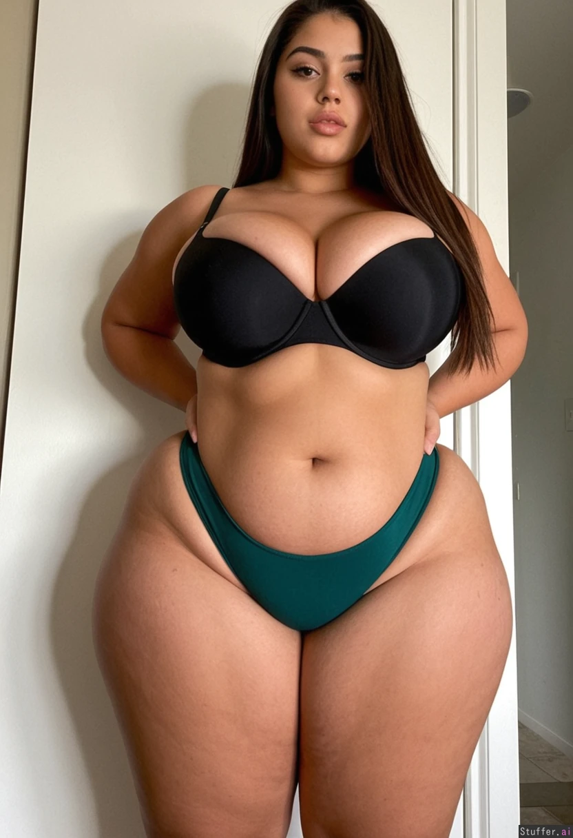 Cute instagram model standing alone (full body view facing camera) Black high heels Cleavage showing Wearing tight perfect fitting dark green thong and black bra Tan skin Slim upper body Brown eyes (Skinny waist) Belly showing (((Massive Large extra round hips)1.0)) (((Massive thick thighs)1.0))