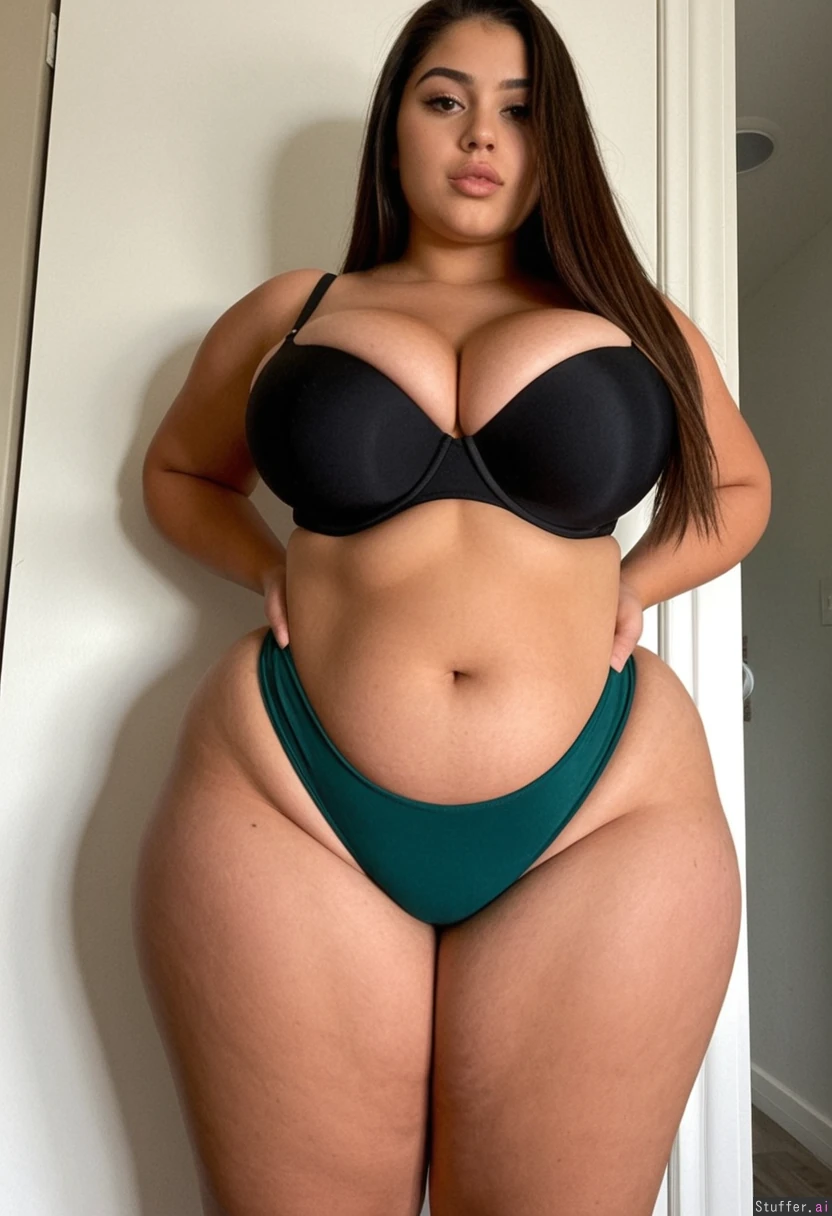 Cute instagram model standing alone (full body view facing camera) Black high heels Cleavage showing Wearing tight perfect fitting dark green thong and black bra Tan skin Slim upper body Brown eyes (Skinny waist) Belly showing (((Massive Large extra round hips)1.2)) (((Massive thick thighs)1.2))