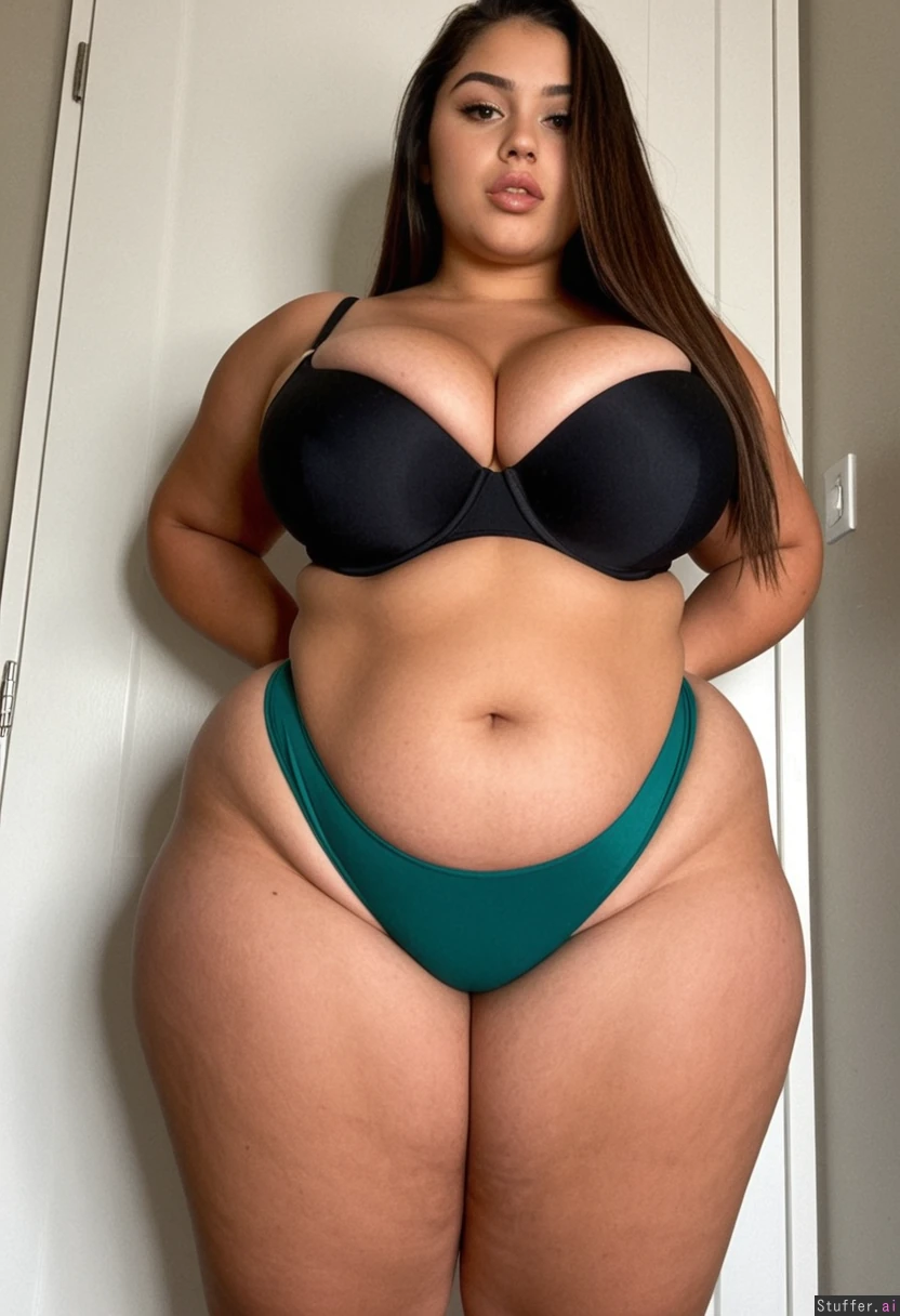 Cute instagram model standing alone (full body view facing camera) Black high heels Cleavage showing Wearing tight perfect fitting dark green thong and black bra Tan skin Slim upper body Brown eyes (Skinny waist) Belly showing (((Hyper Massive Large extra round hips)1.4)) (((Massive thick thighs)1.4))
