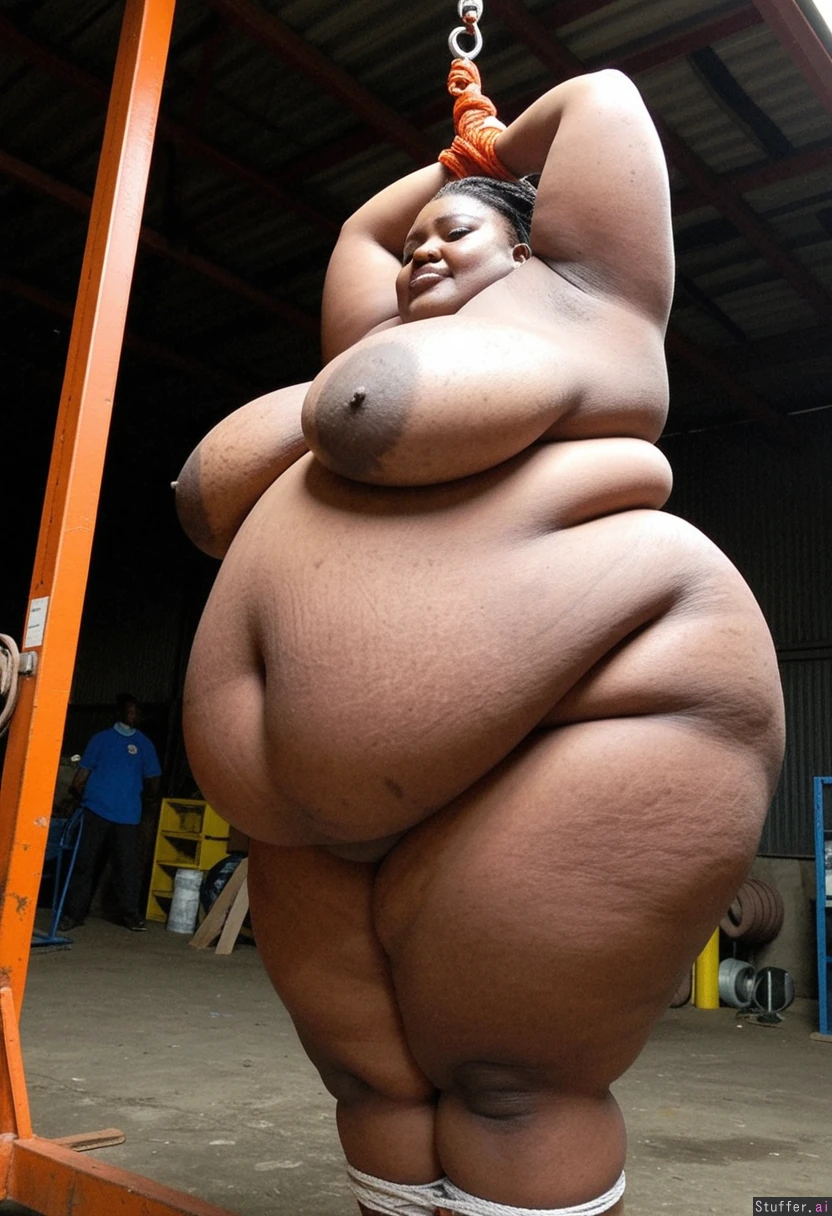 morbidly obese extremely fat big bellied Kenyan BBW with huge tits bound with her writs above her head hanging from a crane inside a dark warehouse on the docks.