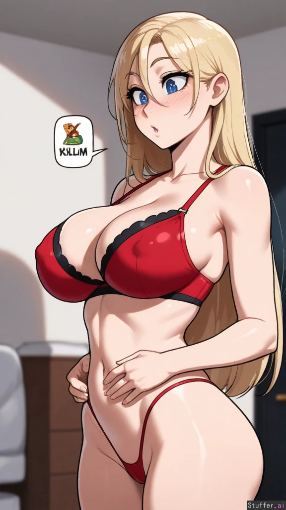 (nyantcha:1.2), (krekkov:1.4), (reiq:1.1), (kittew:1.2), 8k, high resolution, maximum pixel density, masterpiece, (((highly detailed))), ((flawless)), (((high rating))), ((highly detailed face)), full resolution, 8k, high resolution, best quality, detailed eyes, Appearance: Long straight blonde hair with light blue stripes, beautiful wide expressive big sparkling blue eyes, starry pupils, tan skin, freckles, blushing heavily, mischievous eyes, horny, anime-woman, shocked expression, embarrassed, (erect nipples), tall Outfit: tight red bra, thong, exposed cleavage Location: Standing, at home, side-view, looking down at self, lounging, Modifiers: (Slim body:1.8), (enormous breasts:1.0), (plump figure:1.0), (fat butt:0.8), (morbidly obese:1.0), (chubby belly:1.0),