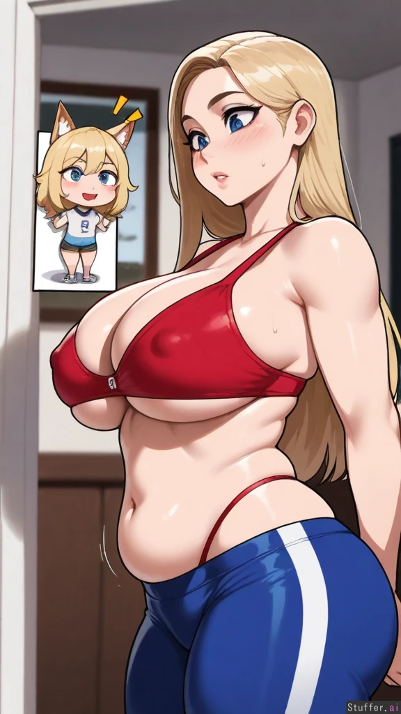 (nyantcha:1.2), (krekkov:1.4), (reiq:1.1), (kittew:1.2), 8k, high resolution, maximum pixel density, masterpiece, (((highly detailed))), ((flawless)), (((high rating))), ((highly detailed face)), full resolution, 8k, high resolution, best quality, detailed eyes, Appearance: Long straight blonde hair with light blue stripes, beautiful wide expressive big sparkling blue eyes, starry pupils, tan skin, freckles, blushing heavily, mischievous eyes, horny, anime-woman, shocked expression, embarrassed, (erect nipples), tall Outfit: tight red bra, thong, exposed cleavage, underboob Location: Standing, at home, side-view, looking down at self, lounging, Modifiers: (Slim body:1.5), (enormous breasts:1.0), (plump figure:1.0), (fat butt:0.8), (morbidly obese:1.0), (chubby belly:1.0),