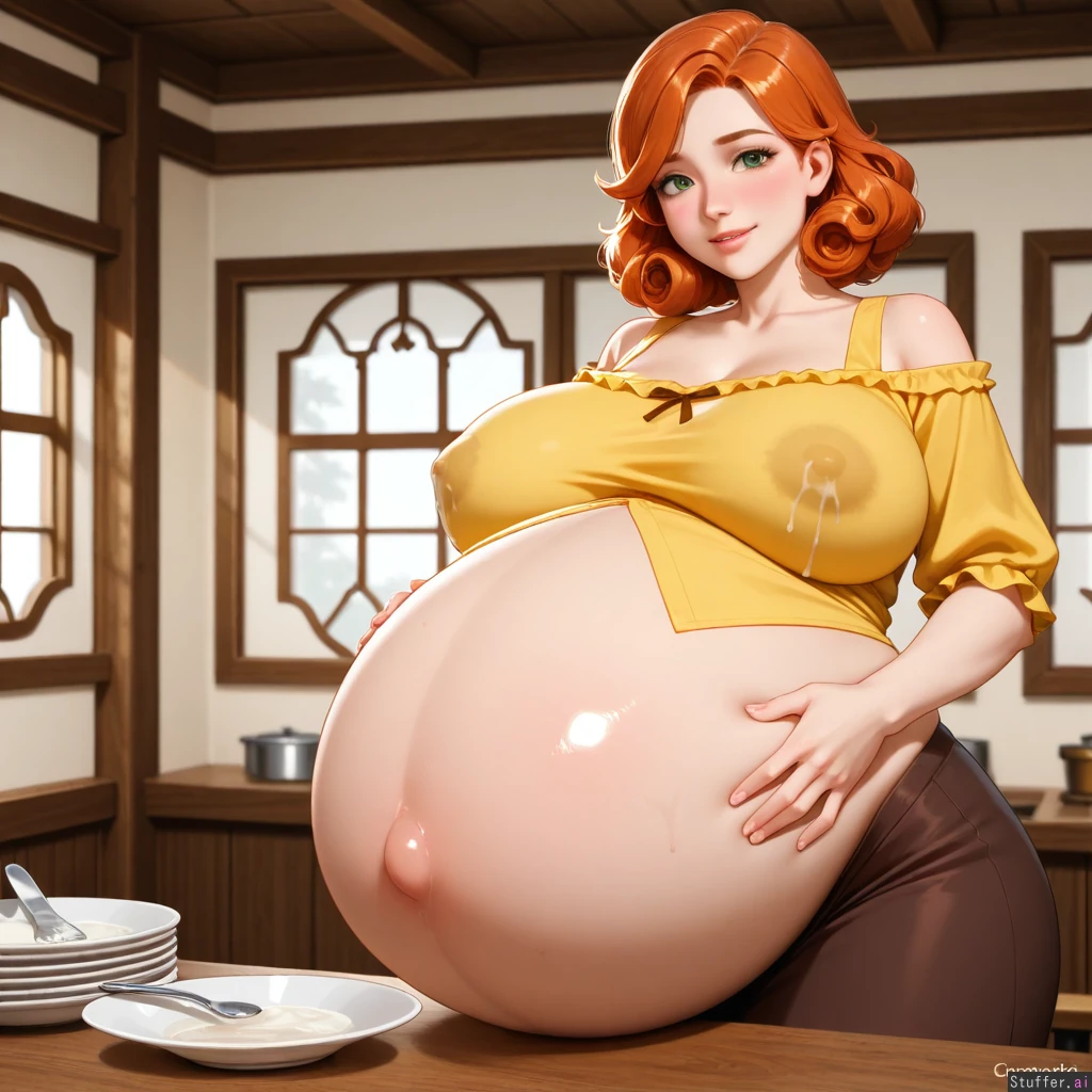 (penny_stardew_valley), solo, (realistic), orange_hair, curly_hair, yellow_blouse, brown_skirt, pink_lips, big_lips, green_eyes, blushing, huge_breasts:1.2, (huge_heavy_pregnant_belly:1.6), huge_butt:1.2, standing_in_front_of_table, smile, looking_at_viewer, (many_dishes_on_table), big_nipples, lactation_through_clothes