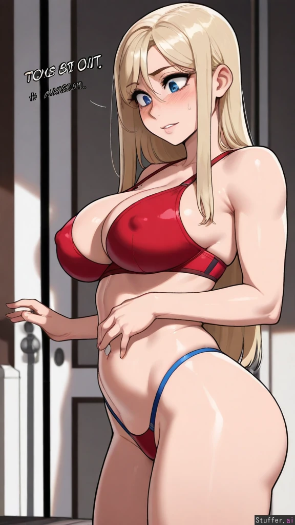 (nyantcha:1.2), (krekkov:1.4), (reiq:1.1), (kittew:1.2), 8k, high resolution, maximum pixel density, masterpiece, (((highly detailed))), ((flawless)), (((high rating))), ((highly detailed face)), full resolution, 8k, high resolution, best quality, detailed eyes, Appearance: Long straight blonde hair with light blue stripes, beautiful wide expressive big sparkling blue eyes, starry pupils, tan skin, freckles, blushing heavily, mischievous eyes, horny, anime-woman, shocked expression, embarrassed, (erect nipples), tall Outfit: tight red bra, thong, exposed cleavage Location: Standing, at home, side-view, looking down at self, lounging, Modifiers: (Slim body:1.65), (enormous breasts:0.8), (plump figure:1.0), (fat butt:0.8), (morbidly obese:1.0), (chubby belly:1.0),