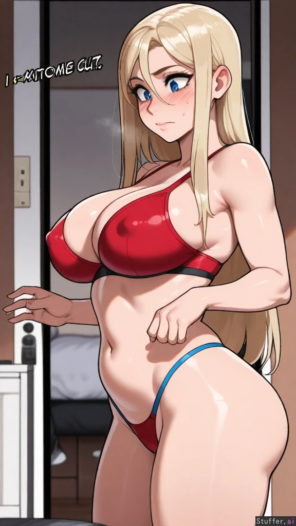 (nyantcha:1.2), (krekkov:1.4), (reiq:1.1), (kittew:1.2), 8k, high resolution, maximum pixel density, masterpiece, (((highly detailed))), ((flawless)), (((high rating))), ((highly detailed face)), full resolution, 8k, high resolution, best quality, detailed eyes, Appearance: Long straight blonde hair with light blue stripes, beautiful wide expressive big sparkling blue eyes, starry pupils, tan skin, freckles, blushing heavily, mischievous eyes, horny, anime-woman, shocked expression, embarrassed, (erect nipples), tall Outfit: tight red bra, thong, exposed cleavage Location: Standing, at home, side-view, looking down at self, lounging, Modifiers: (Slim body:1.6), (enormous breasts:0.8), (plump figure:1.0), (fat butt:0.8), (morbidly obese:1.0), (chubby belly:1.0),