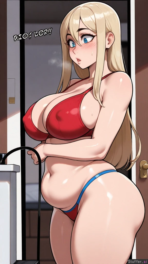 (nyantcha:1.2), (krekkov:1.4), (reiq:1.1), (kittew:1.2), 8k, high resolution, maximum pixel density, masterpiece, (((highly detailed))), ((flawless)), (((high rating))), ((highly detailed face)), full resolution, 8k, high resolution, best quality, detailed eyes, Appearance: Long straight blonde hair with light blue stripes, beautiful wide expressive big sparkling blue eyes, starry pupils, tan skin, freckles, blushing heavily, mischievous eyes, horny, anime-woman, shocked expression, embarrassed, (erect nipples), tall Outfit: tight red bra, thong, exposed cleavage Location: Standing, at home, side-view, looking down at self, lounging, Modifiers: (Slim body:1.5), (enormous breasts:0.8), (plump figure:1.0), (fat butt:0.8), (morbidly obese:1.0), (chubby belly:1.0),