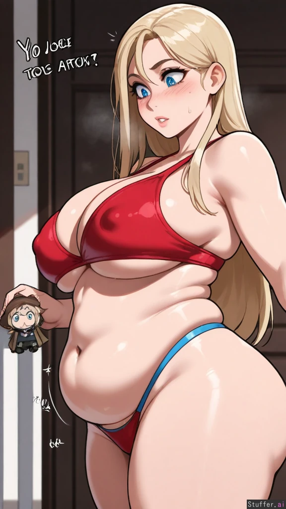 (nyantcha:1.2), (krekkov:1.4), (reiq:1.1), (kittew:1.2), 8k, high resolution, maximum pixel density, masterpiece, (((highly detailed))), ((flawless)), (((high rating))), ((highly detailed face)), full resolution, 8k, high resolution, best quality, detailed eyes, Appearance: Long straight blonde hair with light blue stripes, beautiful wide expressive big sparkling blue eyes, starry pupils, tan skin, freckles, blushing heavily, mischievous eyes, horny, anime-woman, shocked expression, embarrassed, (erect nipples), tall Outfit: very tight red bra, thong, exposed cleavage, underboob Location: Standing, at home, side-view, looking down at self, lounging, Modifiers: (Slim body:1.3), (enormous breasts:0.8), (plump figure:1.0), (fat butt:0.8), (morbidly obese:1.0), (chubby belly:1.0),