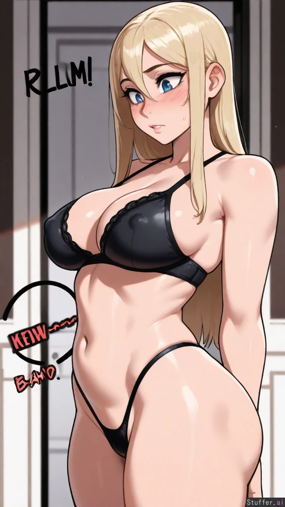 (nyantcha:1.2), (krekkov:1.4), (reiq:1.1), (kittew:1.2), 8k, high resolution, maximum pixel density, masterpiece, (((highly detailed))), ((flawless)), (((high rating))), ((highly detailed face)), full resolution, 8k, high resolution, best quality, detailed eyes, Appearance: Long straight blonde hair with light blue stripes, beautiful wide expressive big sparkling blue eyes, starry pupils, tan skin, freckles, blushing heavily, mischievous eyes, horny, anime-woman, shocked expression, embarrassed, (erect nipples), tall Outfit: tight black lace bra, thong, exposed cleavage Location: Standing, at home, side-view, looking down at self, lounging, Modifiers: (Slim body:1.7), (enormous heavy breasts:0.8), (fat figure:1.0), (fat bubble butt:0.8), (morbidly obese ssbbw:1.0), (fat heavy belly:1.0),