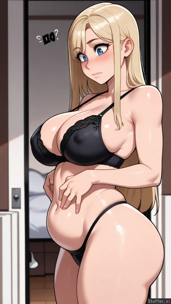 (nyantcha:1.2), (krekkov:1.4), (reiq:1.1), (kittew:1.2), 8k, high resolution, maximum pixel density, masterpiece, (((highly detailed))), ((flawless)), (((high rating))), ((highly detailed face)), full resolution, 8k, high resolution, best quality, detailed eyes, Appearance: Long straight blonde hair with light blue stripes, beautiful wide expressive big sparkling blue eyes, starry pupils, tan skin, freckles, blushing heavily, mischievous eyes, (horny), anime-woman, shocked expression, embarrassed, (erect nipples), tall Outfit: tight black lace bra, thong, exposed cleavage Location: Standing, at home, side-view, looking down at self, lounging, Modifiers: (Slim body:1.6), (enormous heavy breasts:0.83), (fat figure:1.05), (fat bubble butt:0.8), (morbidly obese ssbbw:1.0), (fat heavy belly:1.05),
