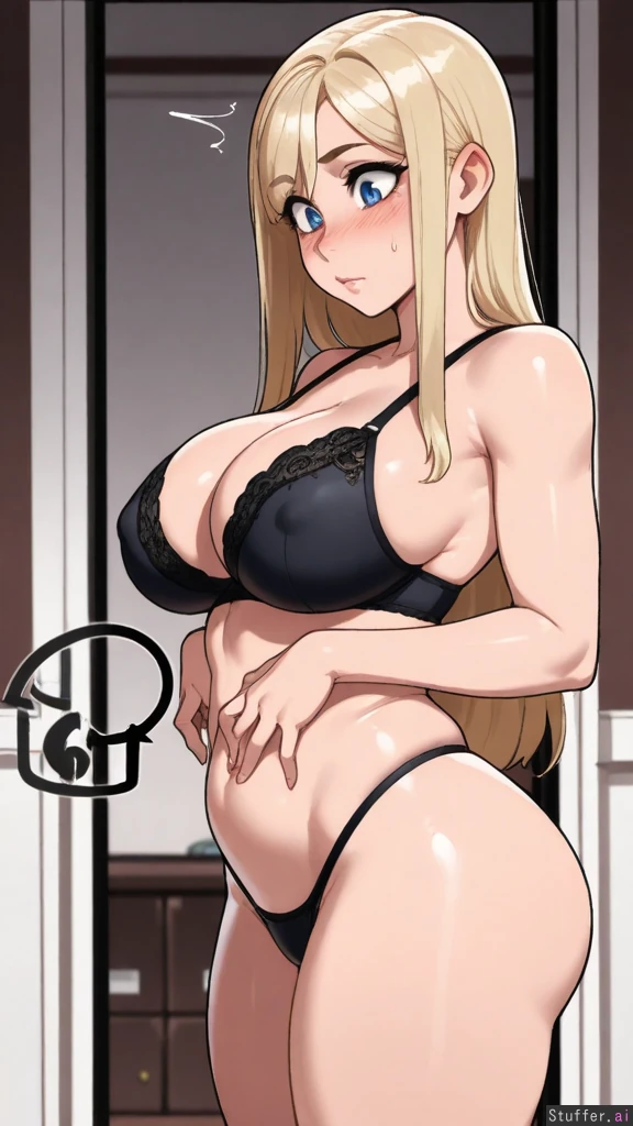 (nyantcha:1.2), (krekkov:1.4), (reiq:1.1), (kittew:1.2), 8k, high resolution, maximum pixel density, masterpiece, (((highly detailed))), ((flawless)), (((high rating))), ((highly detailed face)), full resolution, 8k, high resolution, best quality, detailed eyes, Appearance: Long straight blonde hair with light blue stripes, beautiful wide expressive big sparkling blue eyes, starry pupils, tan skin, freckles, blushing heavily, mischievous eyes, (horny), anime-woman, shocked expression, embarrassed, (erect nipples), tall Outfit: tight black lace bra, thong, exposed cleavage Location: Standing, at home, side-view, looking down at self, lounging, Modifiers: (Slim body:1.6), (enormous heavy breasts:0.83), (fat figure:1.05), (fat bubble butt:0.8), (morbidly obese ssbbw:1.0), (fat heavy belly:1.0),