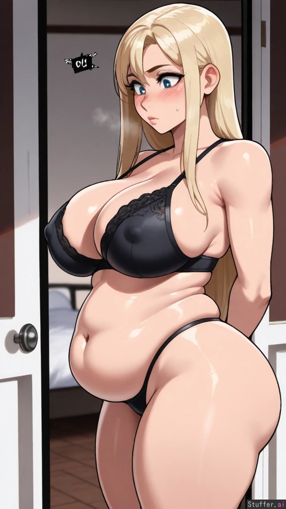 (nyantcha:1.2), (krekkov:1.4), (reiq:1.1), (kittew:1.2), 8k, high resolution, maximum pixel density, masterpiece, (((highly detailed))), ((flawless)), (((high rating))), ((highly detailed face)), full resolution, 8k, high resolution, best quality, detailed eyes, Appearance: Long straight blonde hair with light blue stripes, beautiful wide expressive big sparkling blue eyes, starry pupils, tan skin, freckles, blushing heavily, mischievous eyes, (horny), anime-woman, shocked expression, embarrassed, (erect nipples), tall Outfit: tight black lace bra, thong, exposed cleavage Location: Standing, at home, side-view, looking down at self, lounging, Modifiers: (Slim body:1.5), (enormous heavy breasts:0.85), (fat figure:1.1), (fat bubble butt:0.8), (morbidly obese ssbbw:1.0), (fat heavy belly:1.05),
